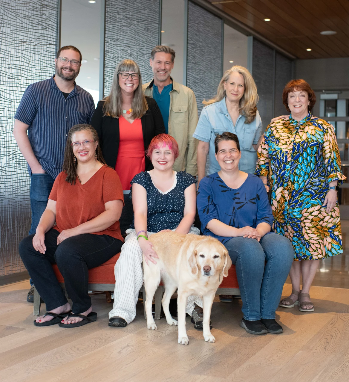 Above: A portrait of most of the ADTR training team at a Conference in Seattle. Director Colleen Connor is standing center holding her golden lab Seeing Eye Dog Joplin. Roy Samuelson is tall, with swoopy hair and a saltier-than-peppery scruffy beard, and Colleen is shorter and pale with a pink pixie haircut.