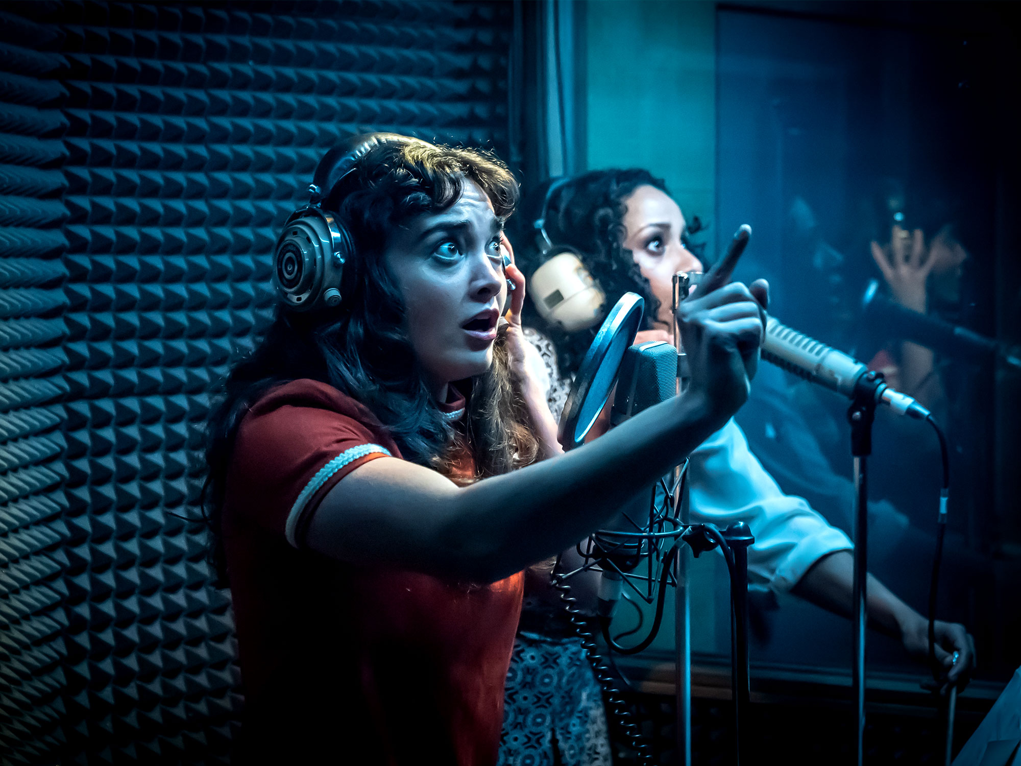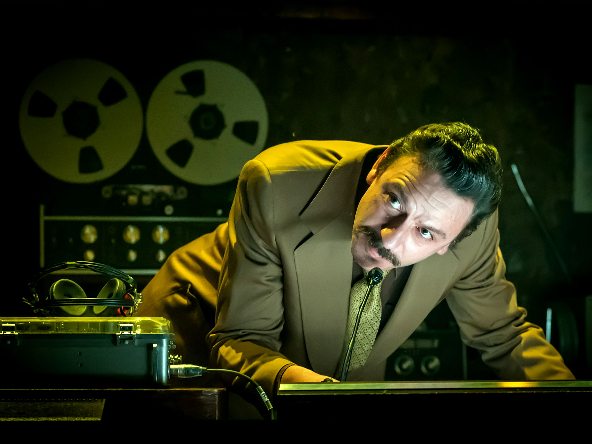 Conceived for the stage by Joel Horwood and Tom Scutt, and written by Horwood, the theatrical version also plays upon the linguistic isolation of Gilderoy (Tom Brooke), surrounded by Italian that he struggles to understand. The only other English speakers in the studio are brutish producer Francesco (Enzo Cilenti), sympathetic dubbing artist Sylvia (Lara Rossi) and the film’s director Santini (Luke Pasqualino). And so the already alienated, anally retentive engineer retreats into his little world of processed and distorted recordings, soon finding his memories from his Dorking home (preserved in tapes sent by his mother) and the moral horror of his current work all merging into a single, confused soundscape.
