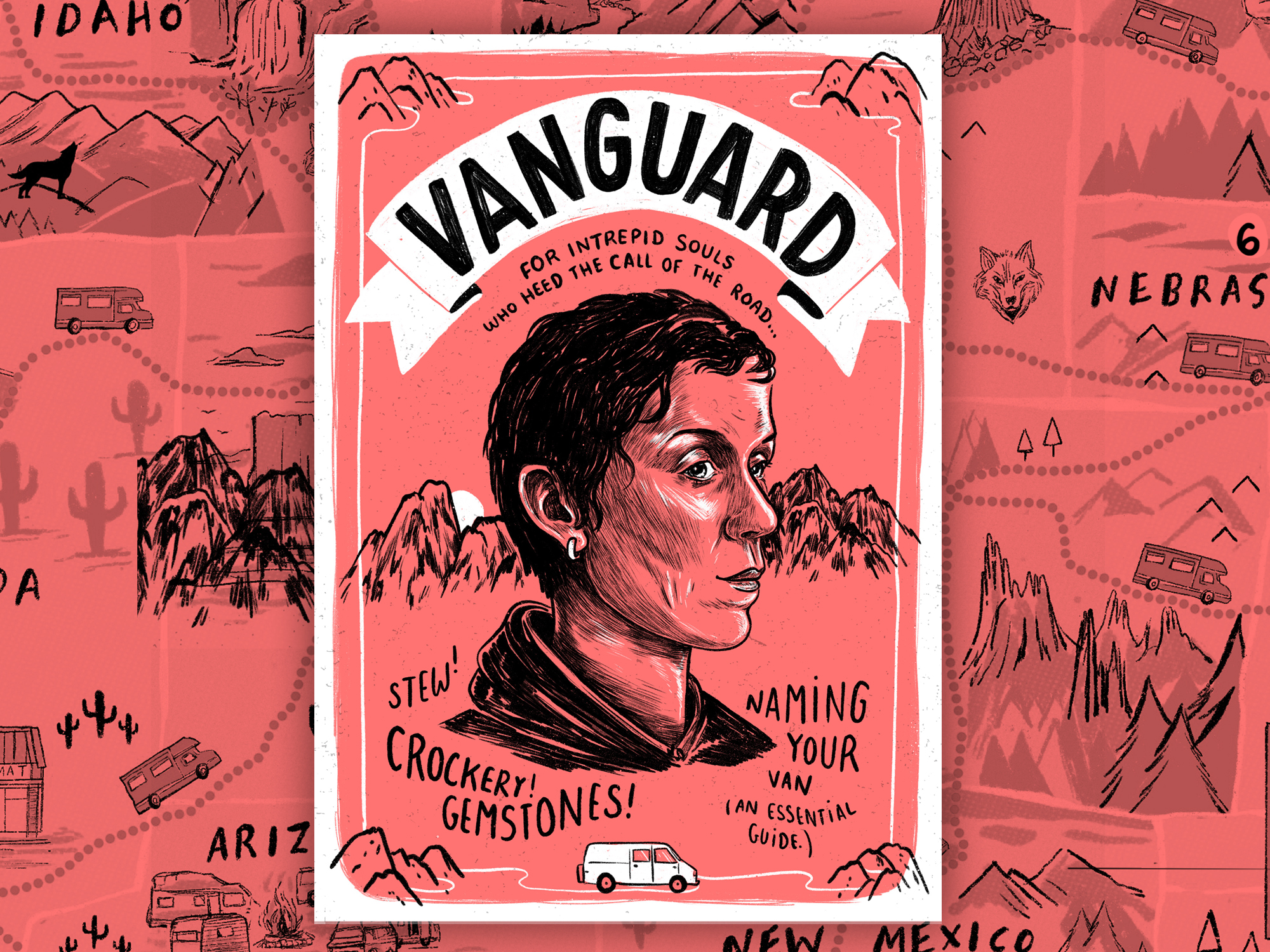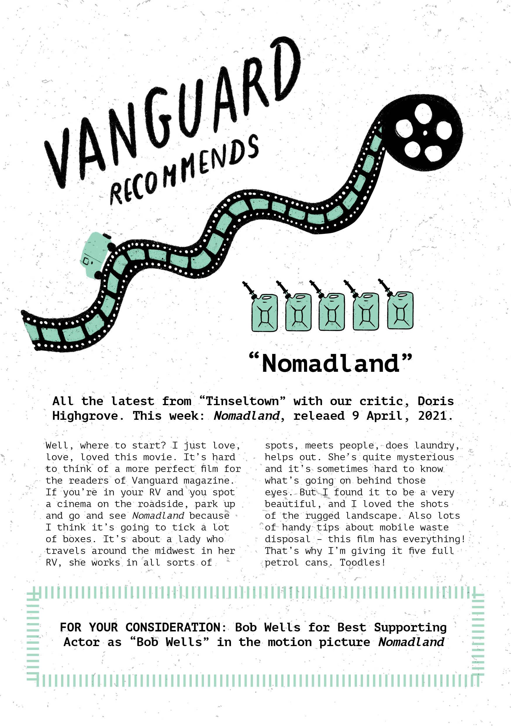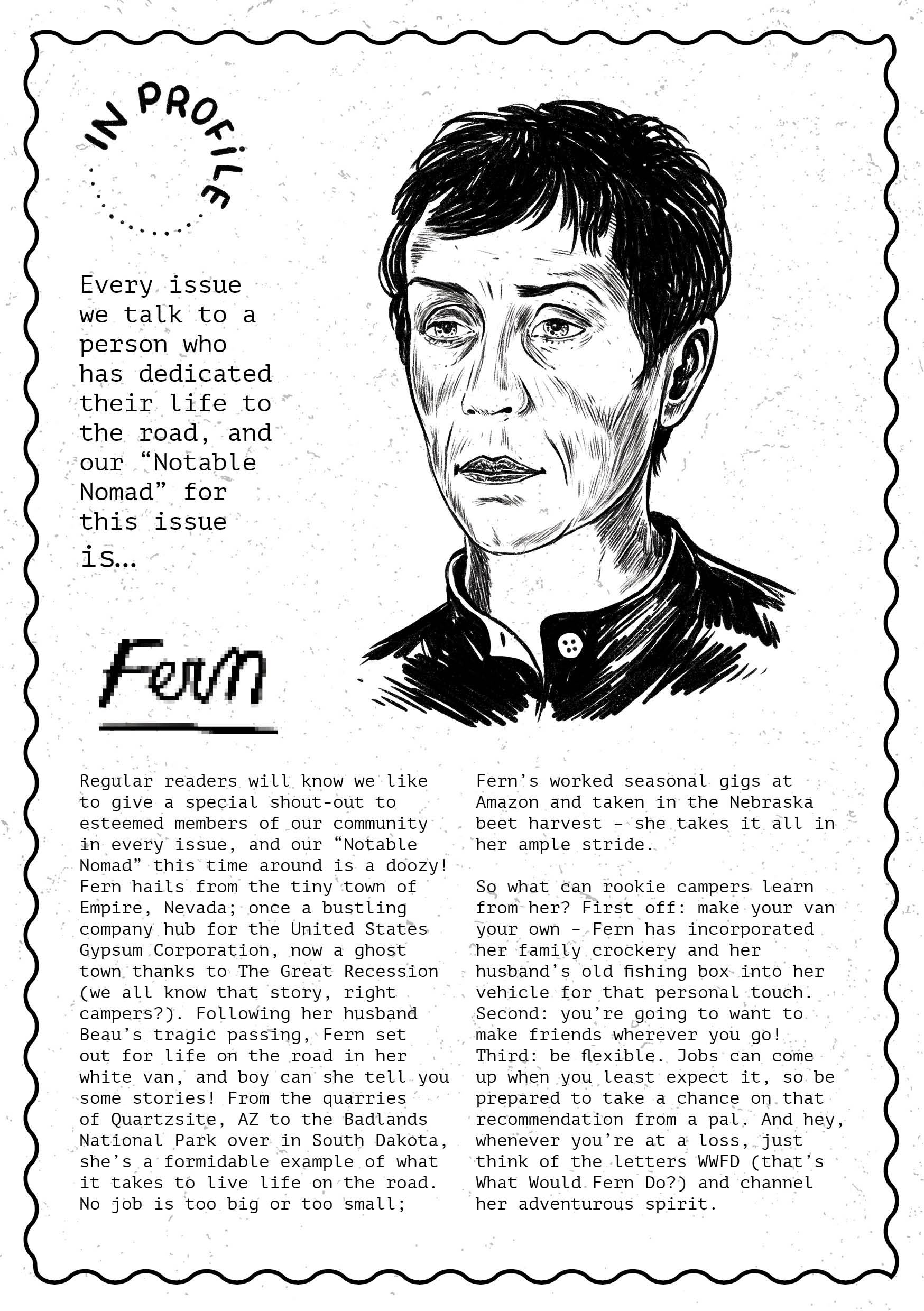 To celebrate the film’s UK release, we made a 12-page zine intended to exist inside the world of Nomadland, beautifully illustrated by Rumbidzai Savanhu and our very own Laurène Boglio. Inside you’ll find a profile of our “Notable Nomad” of the month, Fern, as well as a guide to naming your van, Merle’s crockery corner, and much more.