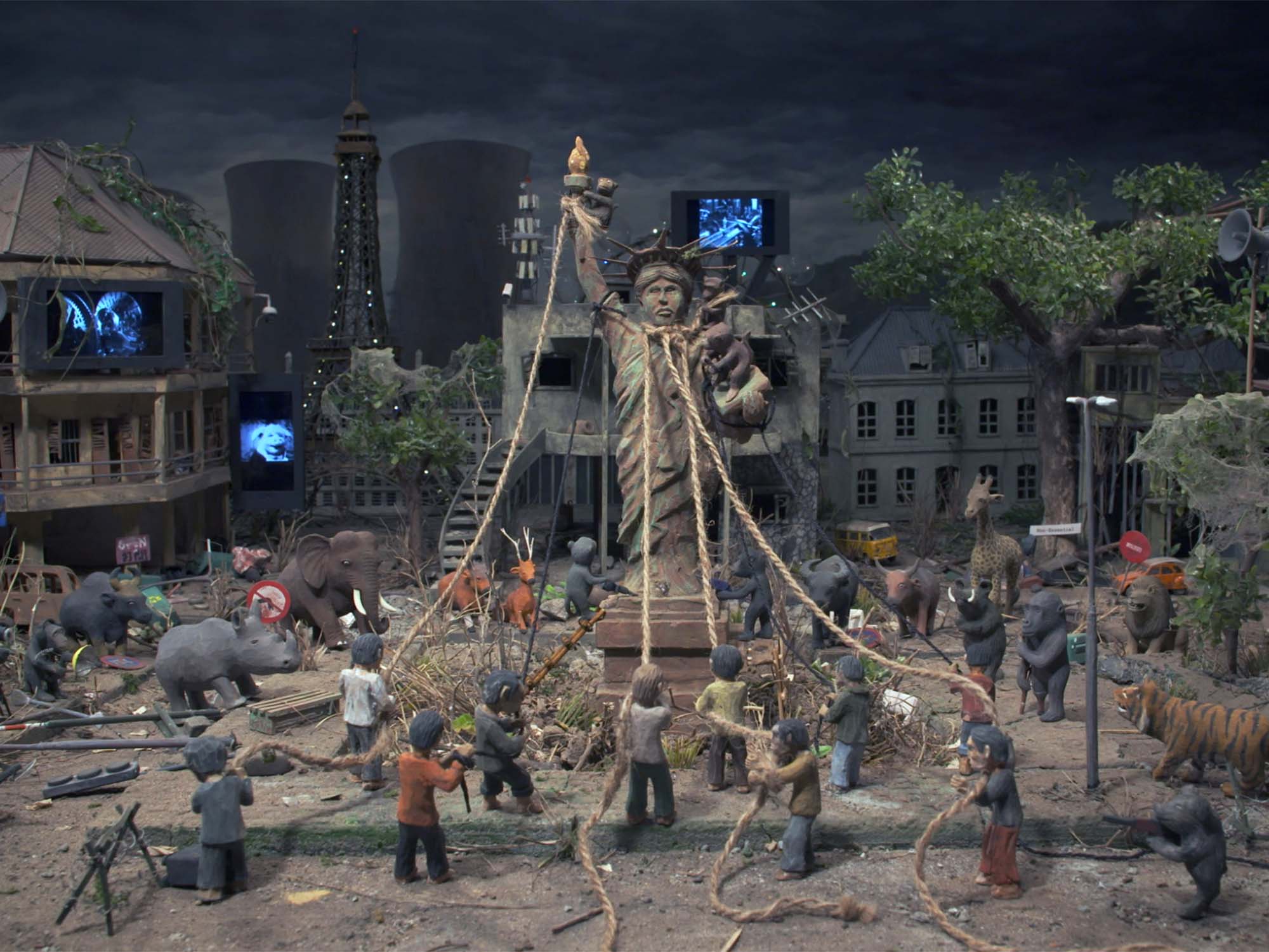 The film is idiosyncratic and surreal, and as a result, fairly difficult to describe effectively. Over a series of intricately crafted tableaux, the mobs of monkeys, boars, and lions that have taken charge of the planet are staged congregating within miniature landscapes. Within these, the animals are generally seen watching giant screens displaying archival material collected from across 20th-century human history, much of which involves violence, death, and brutality. Laid over the top is poetic narration voiced by Rebecca Marder and co-written by Panh with actress Agnès Sénémaud and writer Christophe Bataille. Musing on everything from art, cinema, technology, human nature, and political history, this narration is intellectual and wide-ranging, but often also difficult to process, feeling loose and rambling to the point that it occasionally feels like the French original language script may have been mistranslated.