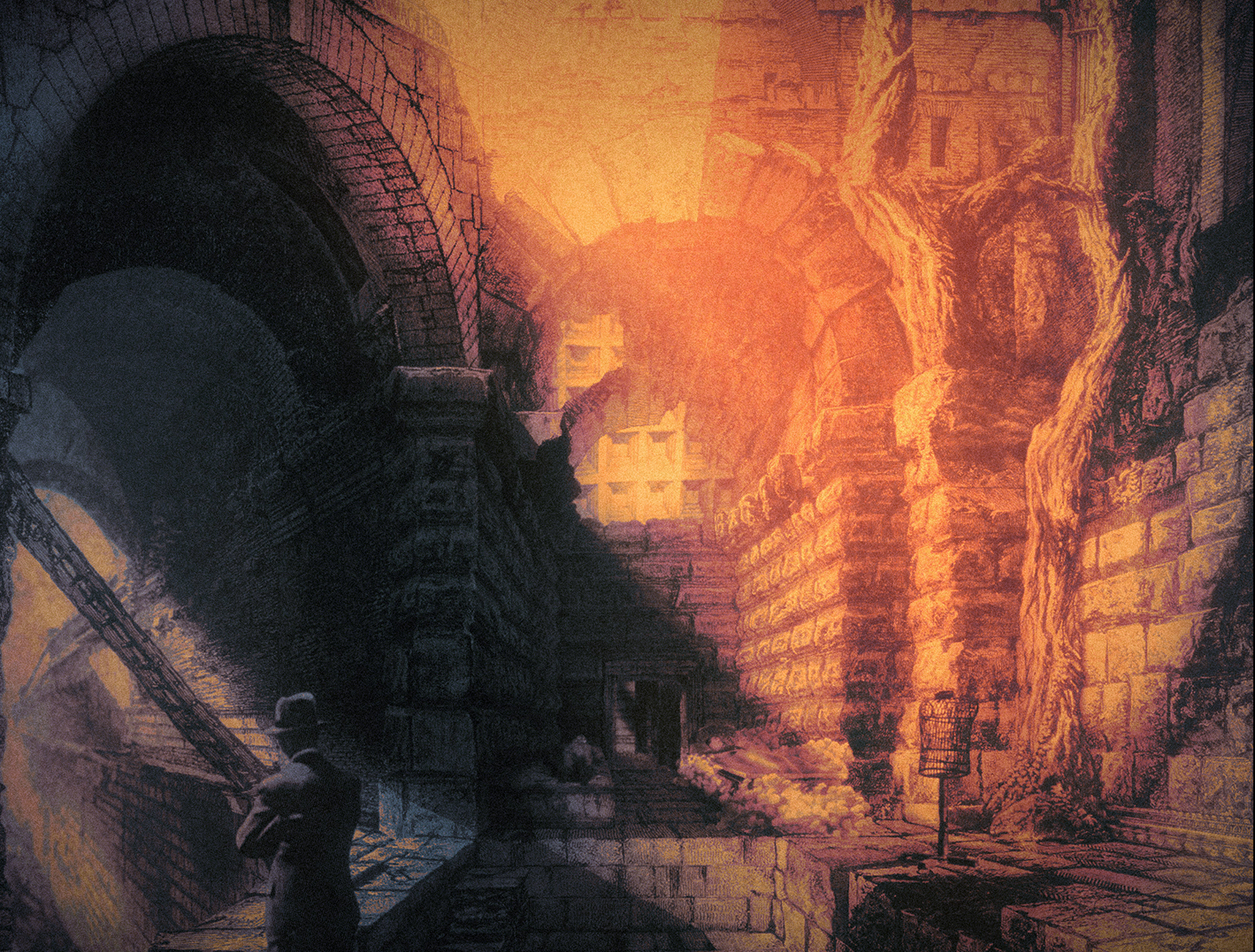 We descend into a place referred to as “Paradise”, with an orange hellfire visible in the middle distance. Yet all colour is quickly drained away and we’re forthwith entrenched in a pallid monochrome expanse that resembles the slopes of a crumbling pyramid. The body of Josef Stalin is seen lying in state, but then he begins to talk. He glances over to the body on the slab across the room. It’s Jesus, who engages the Communist godhead in a comically squeaky voice.