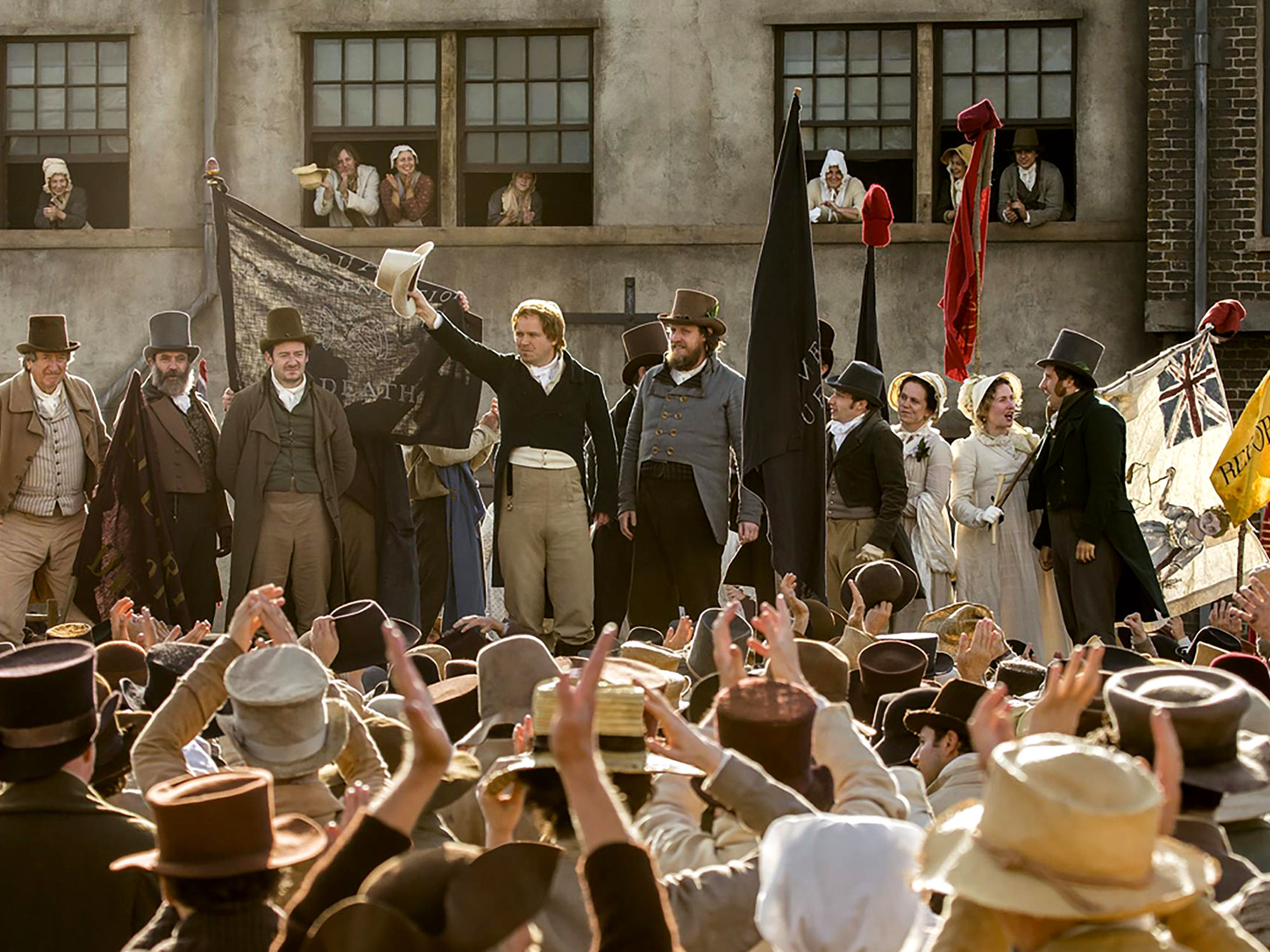 Appropriate for the period, various characters feel ripped from the comic strips of William Hogarth, such as the jowly magistrates who conspire to ambush tens of thousands of unarmed protestors, and a pair of tongue-jutting hayseeds who gatecrash a meeting of parliamentary reformers in London. There’s also an unexpected Blackadder homage in the form of Tim McInnerny’s Prince Regent, with Marion Bailey (who played JMW Turner’s landlady-turned-mistress in Leigh’s previous film) camping it up as the mad Prince’s fawning courtier, Lady Conyngham. While these caricatures may not strike a chord with everyone, they add colour and texture to what might otherwise have been a dry, didactic portrait of liberty and tyranny.