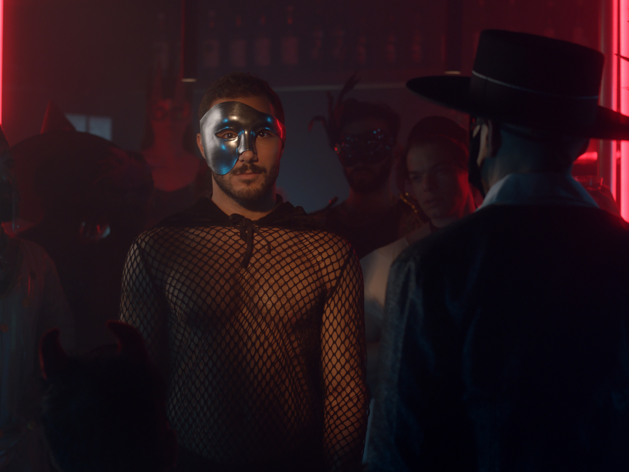 Actors are placed against green screen backgrounds and transported into fantastical realms. The intersecting accounts from one-night Grindr hook-ups and the longing for romance is turned into theatre and spectacle through a queer lens. Sexual pleasure is transported from the intimate space of the bedroom to a white void of posed recreations of sex positions and passionate threesomes, and the written flirtations of a private message is read against a sexually-charged pure love between men that drops the pretence of restraint.