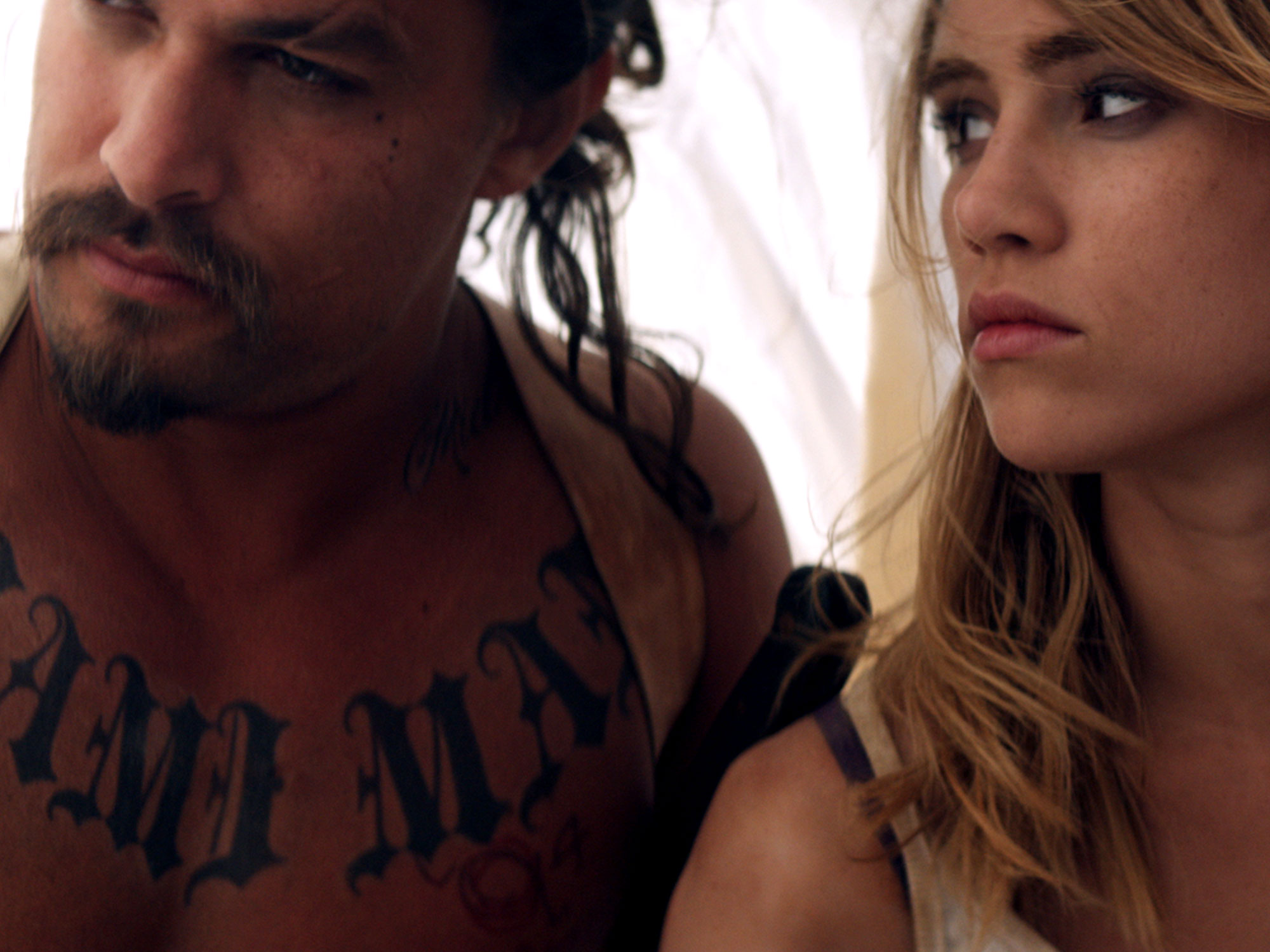 Outside of the compound is a place known as “the Bridge” where the cannibals reside in hollowed out airplanes and trailers. Mad Max is a clear influence, though Amirpour’s film possess neither its furious pace nor an enthralling heroine of its own. Instead the director delights in summoning the spirit of a range of ’80s B‑movies. Jason Momoa takes the role of a Cuban maneater who sports a giant tattoo displaying the words ‘Miami Man’ on his chest. He’s a silent, brooding artist who listens to Culture Club on his Walkman and sketches beautiful drawings.