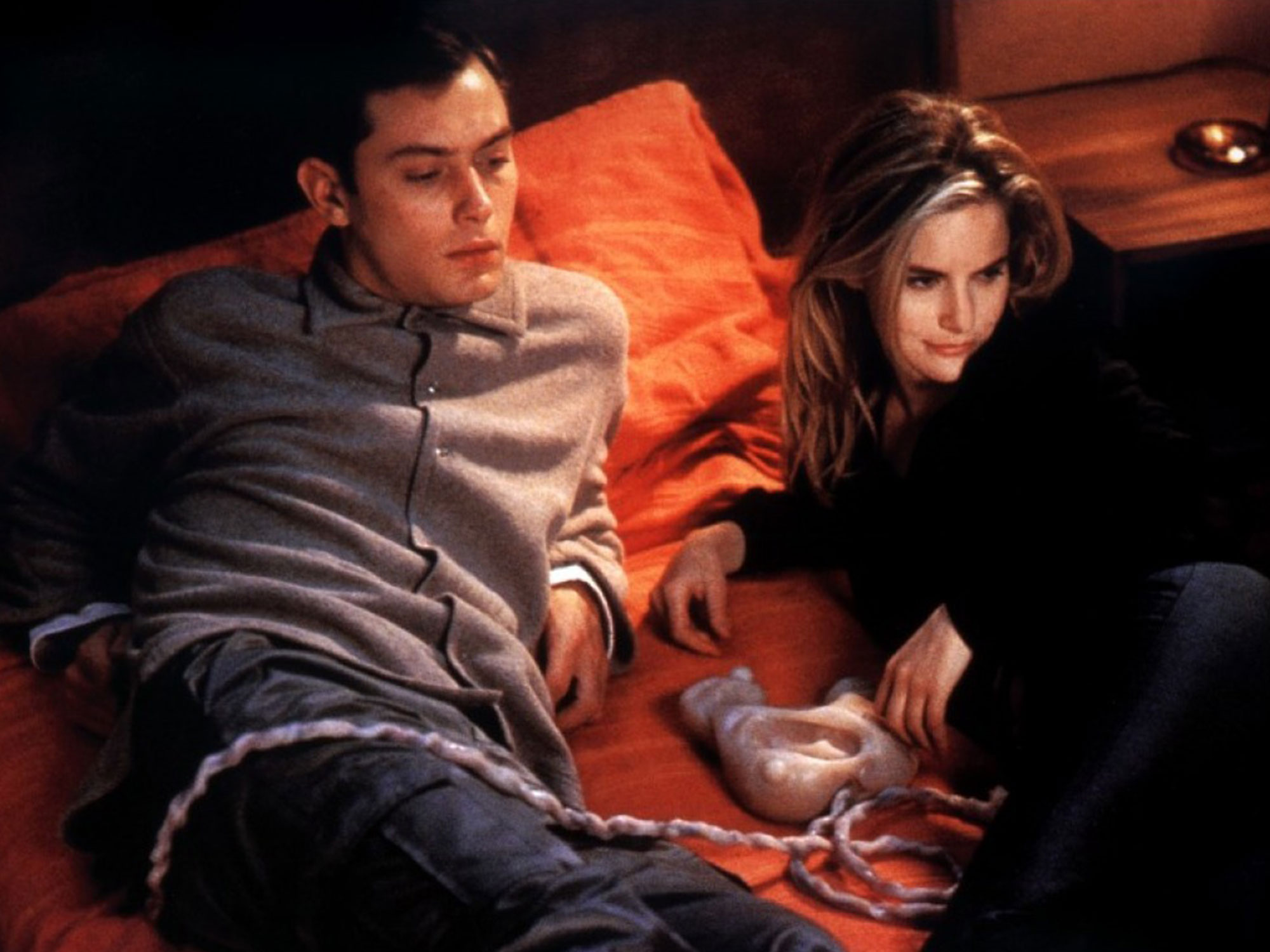‘PR nerd’ Ted Pikul (Jude Law) is a newcomer to virtual-reality gaming, and while his responsibility to keep superstar game designer Allegra Geller (Jennifer Jason Leigh) safe from a shadowy cadre of anti-game zealots requires him to plug in and play for his first time, diving deep into her constructed reality, his response to the all-encompassing experience is aways tempered with a measure of resistance. “I’m feeling a little disconnected from my real life. Kinda losing touch with the texture of it, do you know what I mean? I mean, I actually think there’s an element of psychosis here,” Ted tells Allegra at another time, before actually pausing the game for a breather. The problem is that there can be no real escape.