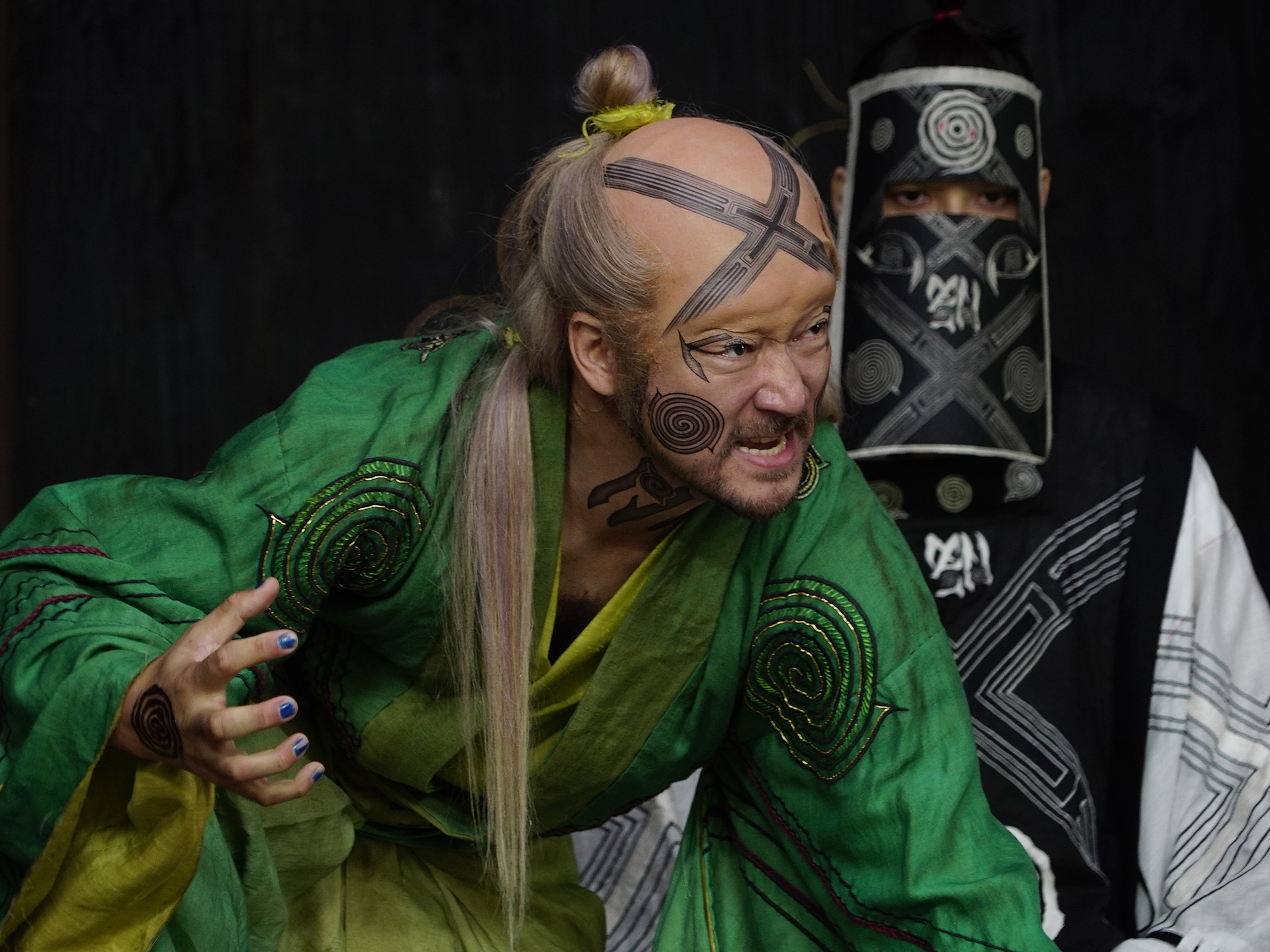 Adapted from Ko Machida’s 2014 novel Punk Samurai Slash Down, Punk Samurai (Pankiu-zamurai, kirarete sôrô) focuses on the rōnin Junoshin Kake (Gô Ayano), whose first act upon entering the northern domain of Kuroaei at the film’s beginning is to cut down, without provocation, a father travelling on a pilgrimage with his blind daughter. Confronted over this callous act by nervous local clansman Shume Nagaoke (Kôen Kondô), Kake warns that the man was a member of the Bellyshaker Party, a bizarre cult who have brought rioting and ruin wherever they go.