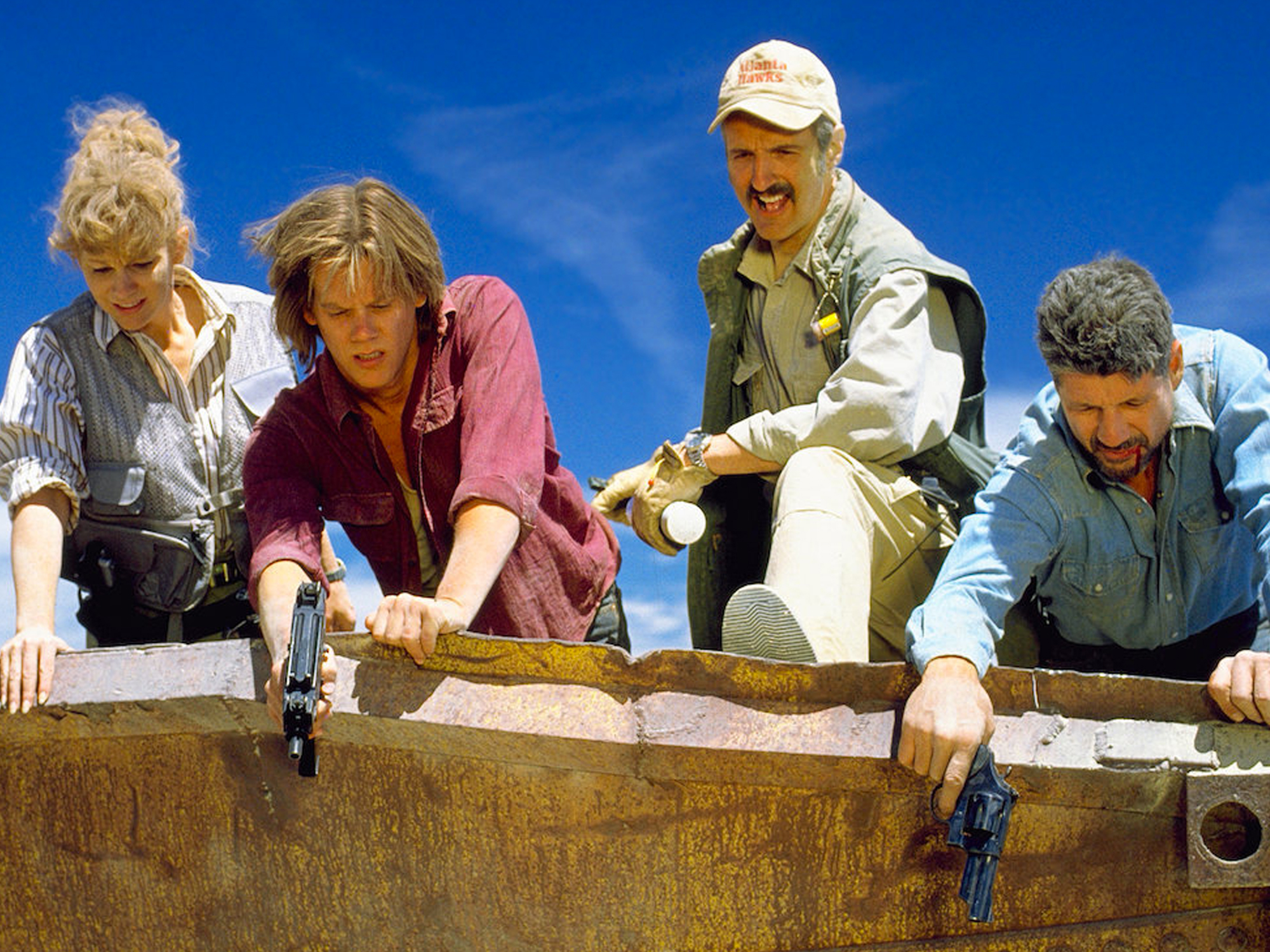 Tremors combines the gigantic worms from Dune and (a hilariously slowed-down version of) the cross-country truck dash from George Miller’s Mad Max 2 (1981), while getting everybody to play the floor is lava over a very wide desert area. Propelled by impressive practical effects, this is an oater-inflected monster movie which fully embraces its own icky absurdity and literally low culture – but the film’s hidden weapon is a strong focus on characterisation. For by taking its time to introduce the denizens of Perfection, and to show the eccentric interactions between this motley crew, Underwood’s feature gets us to like and care about all those who are endangered, so that we can laugh along with their banter even as we worry about their fates.