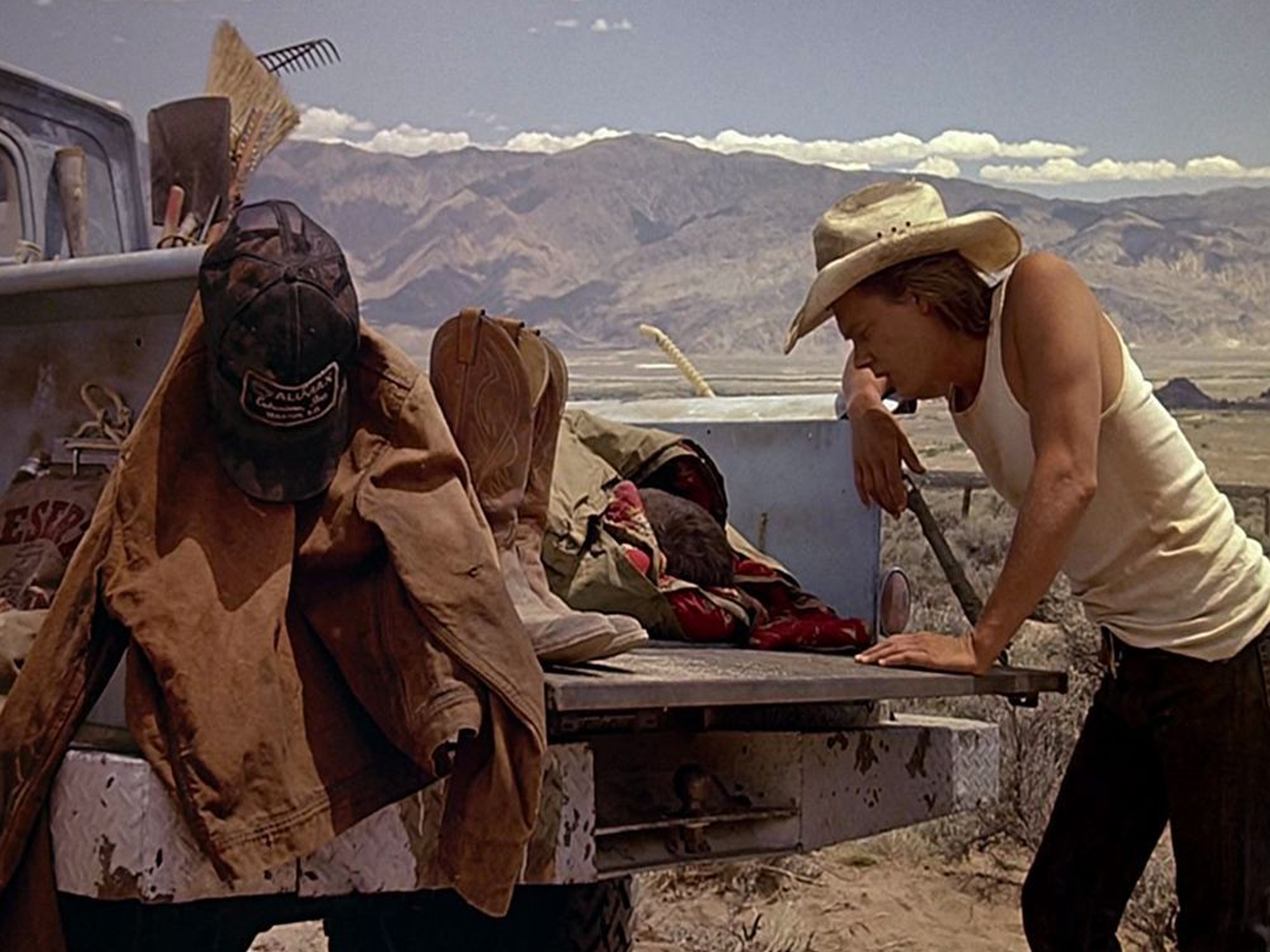 Consequently, in both shots, his ‘trouser snake’, though key to what has just happened, remains invisible, in a touch of what is as much coquettish flirtation with the viewer as prudish decorum. ‘Val’ then gives his older pal Earl Bassett (Fred Ward), asleep in the back of the pick-up, such a loud and rude awakening that the alarmed slumberer falls out and onto the ground, still wriggling in his sleeping bag like a worm. Concealed snakes. Worms in the dirt.