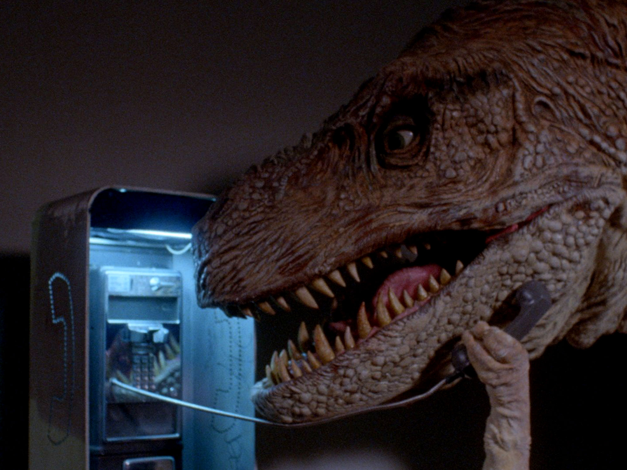 Yet Gunther’s words here come with a metacinematic resonance. For Stewart Raffill (The Ice Pirates, The Philadelphia Experiment, Mac and Me) was offered, out of the blue, the use of an animatronic tyrannosaur for a specific two-week period, and while the writer/director could sniff opportunity, he had very little time in which to throw together a screenplay that would flesh out this giant moving prop with a plot, with brains, and maybe with the kind of immortality that box office success can bring. Maybe – although Raffill also had enough self-awareness to make Wachenstein’s computer-savvy technician Bobby (John Franklin) quietly dismiss his boss’ grand ambitions with the comment: “What a crock of shit.”
