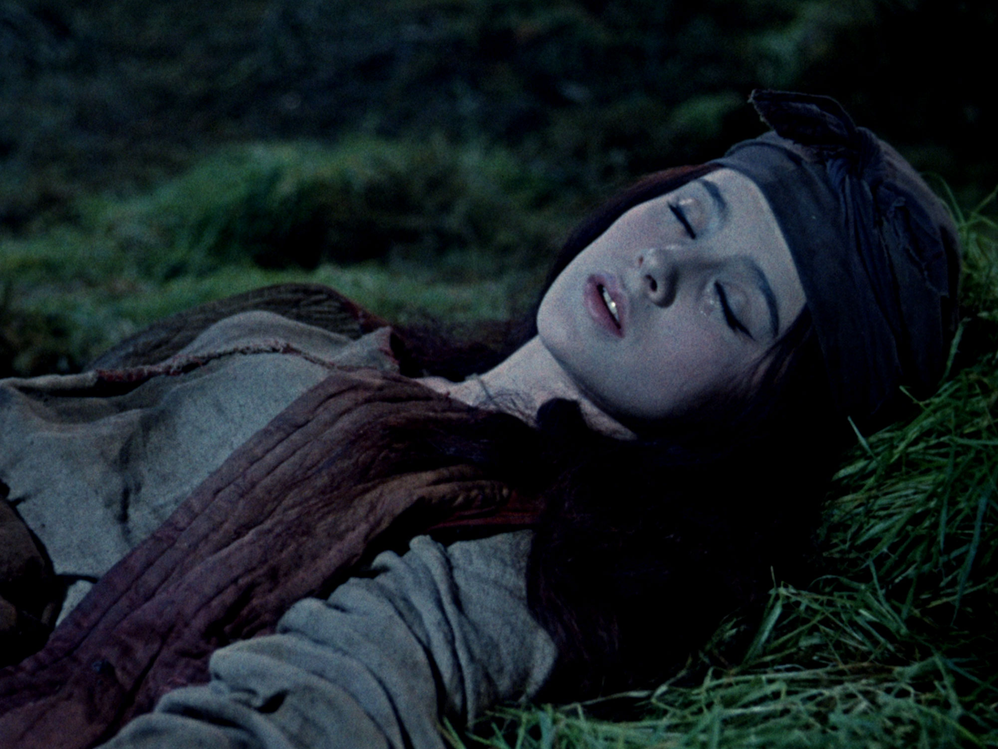 His supposed priestly chastity, her very advanced years, and some very sadomasochistic, psychosexual imagery, all give this scene a nightmarish quality, while the fact that the old woman is played by a man (Nikolay Kutuzov) only adds to the sense that we are bearing covert witness to something very transgressive. This nocturnal flight of fancy, unfolding in an ambiguous space between the real and the oneiric, will end with Khoma viciously beating the old woman with a stick to within an inch of her life, and seeing her transform into a much younger woman (Natalya Varley).