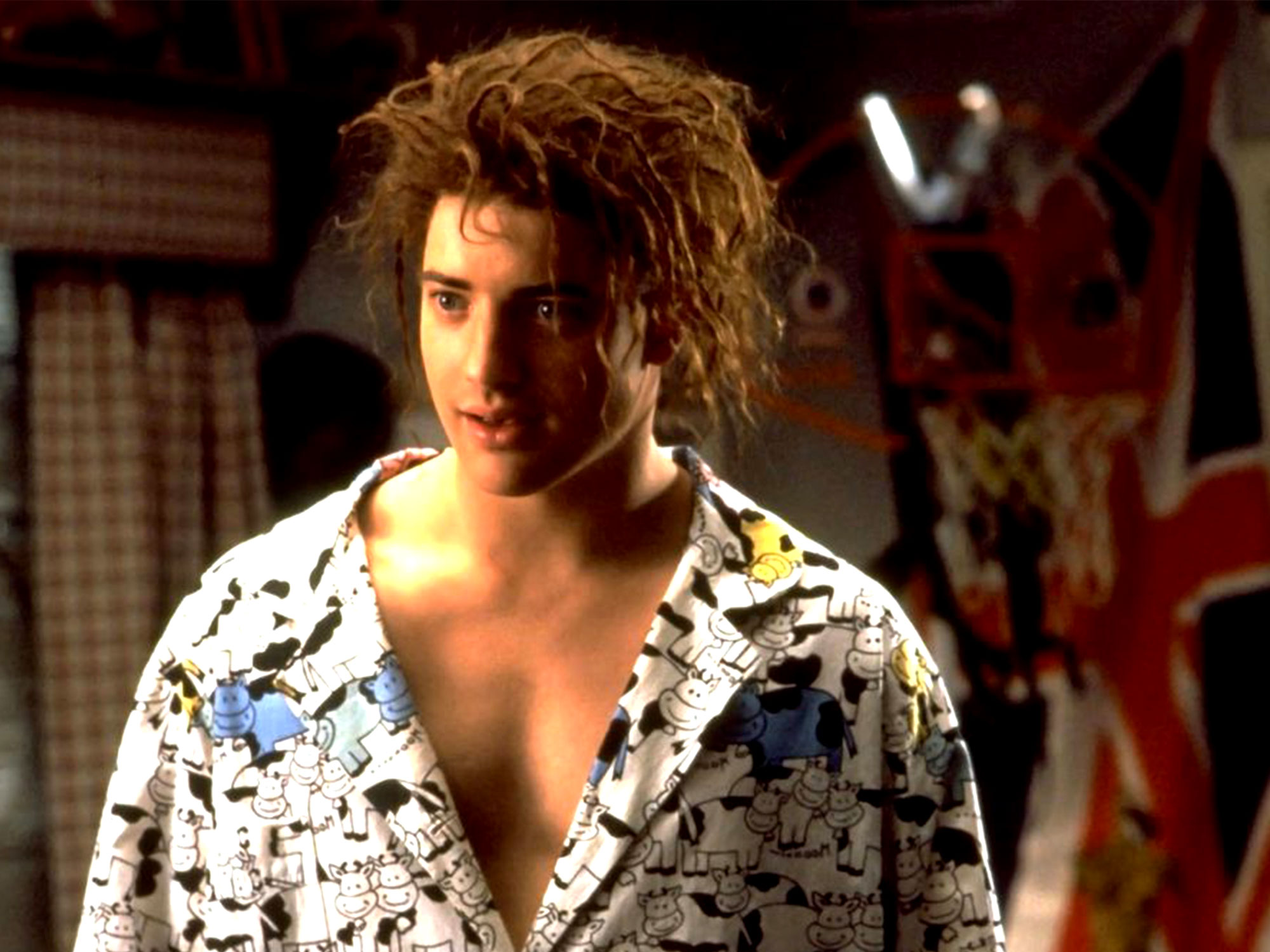 In the final film of his Himbo Trilogy, 1999’s Blast from the Past, Fraser plays Adam, a man who’s been sequestered by his own paranoid parents in an underground bunker for fear of a nuclear war. When he leaves the bunker to get supplies, he discovers that there has been no attack; his favourite sitcom I Love Lucy has been off the air for decades and meets his love interest Eve (Alicia Silverstone), a peak ’90s woman who shows him around the strange new world.