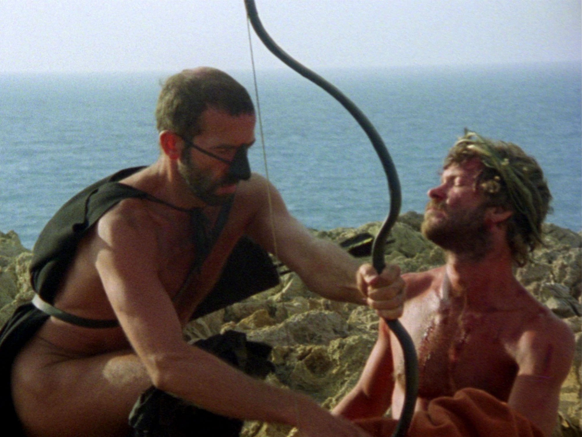 The way Jarman captures the male bodies of Sebastiane and his fellow soldiers, showing them as desirable, as queer, still feels rare in contemporary queer cinema. The men move between a kind of ‘no-homo’ bragging to moments of astonishing intimacy, as when they swim together and are seemingly revitalised by the water, or when Sebastiane takes off his general’s armour. Everything from the language to the presentation of masculinity (something that at once offers these men companionship, but limits how they can express themselves around each other) makes the film feel distinctly modern.