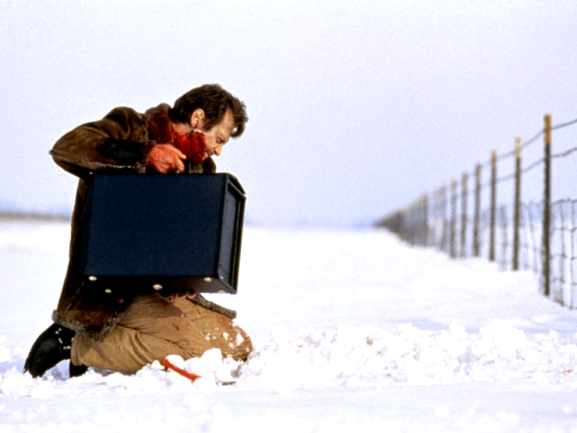 What is established in that opening frame, where the film’s raison d’etre is laid out in quasi-legal copy, is a pact between filmmaker and film lover. The Coens extend their woolly-gloved hands out courteously with a promise that you can trust them, and you take it. Of course, expectations are made to be broken. Broken, bent, reduced to a pulpy mash and spat out from an industrial woodchipper. In Fargo, fact and fiction blur into the powder-white North Dakota winter, where the snow is stained pink by the copious amounts of blood spilled.