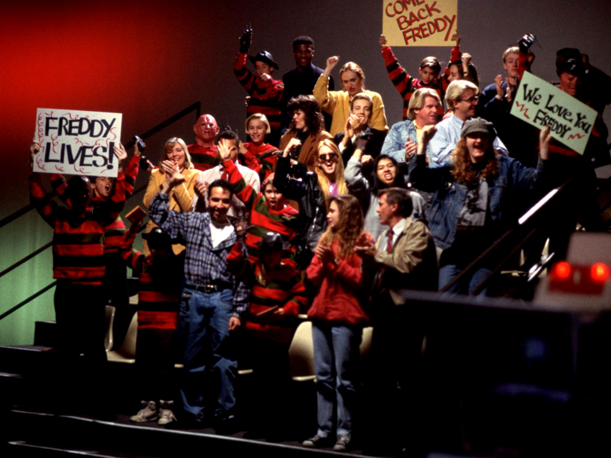 In one of the film’s strangest scenes, Langenkamp is interviewed on a TV chat show. To her surprise, actor Robert Englund is brought out in full Freddy attire, waving his menacing claws to an audience full of adoring children who are all dressed in his famous striped jumper and waving signs declaring, ‘We love you Freddy!’ alongside their parents. He even high fives one small child wearing a Freddy mask. The scene is particularly disturbing when you consider the character has always been a paedophile, someone who preys on young children and is burned alive by vengeful parents in the first film.