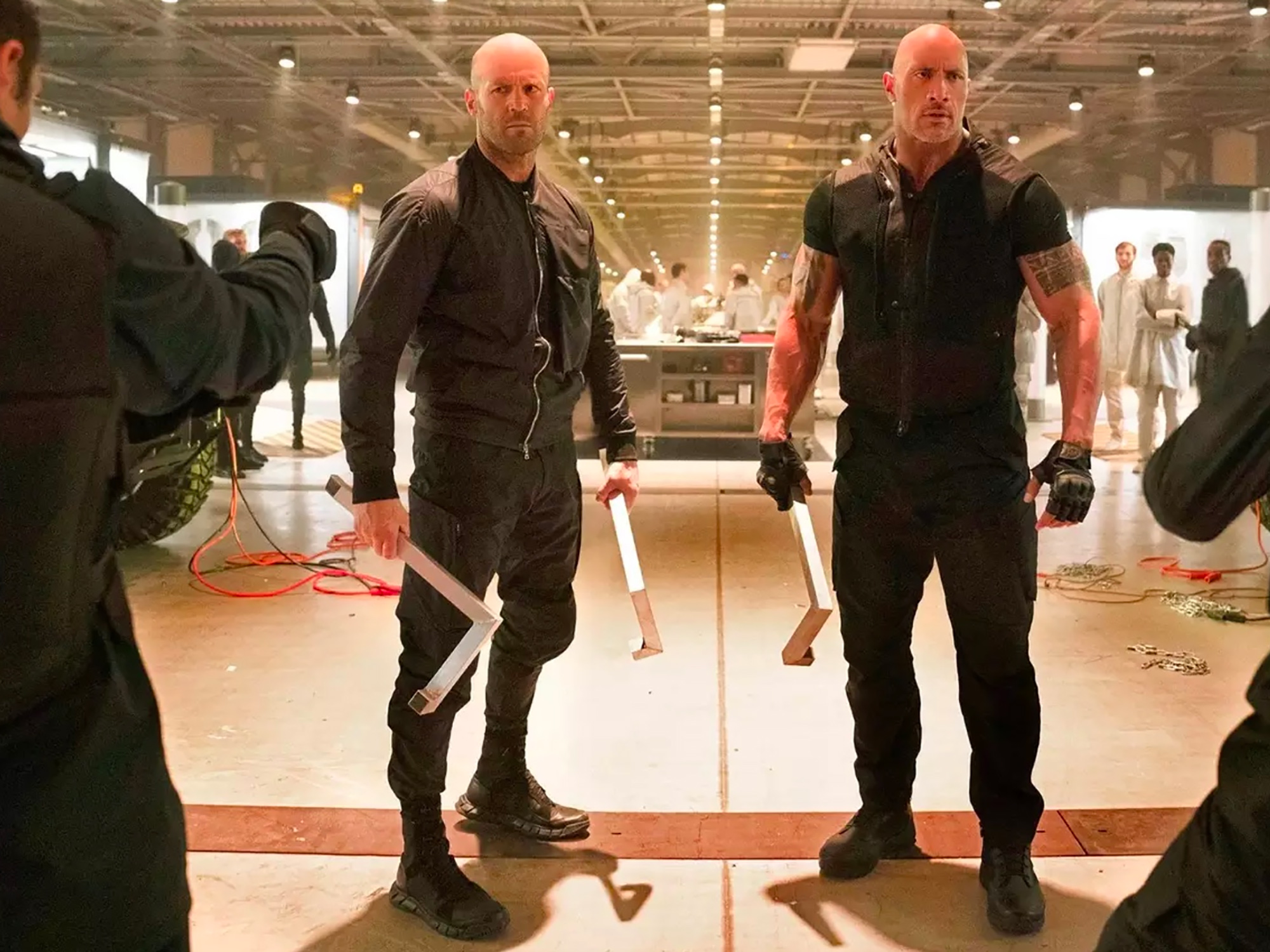 Hobbs and Shaw’s valiant mission to stop Brixton before he conquers Earth or destroys all cars or whatever his plan might be drags the men through an obstacle course of big-budget spectacle, where skyscraper free-falls and building-leveling crashes are the order of the day. The only way to survive will be through trust, friendship, and macho one-liners delivered through a pearly-white grin.