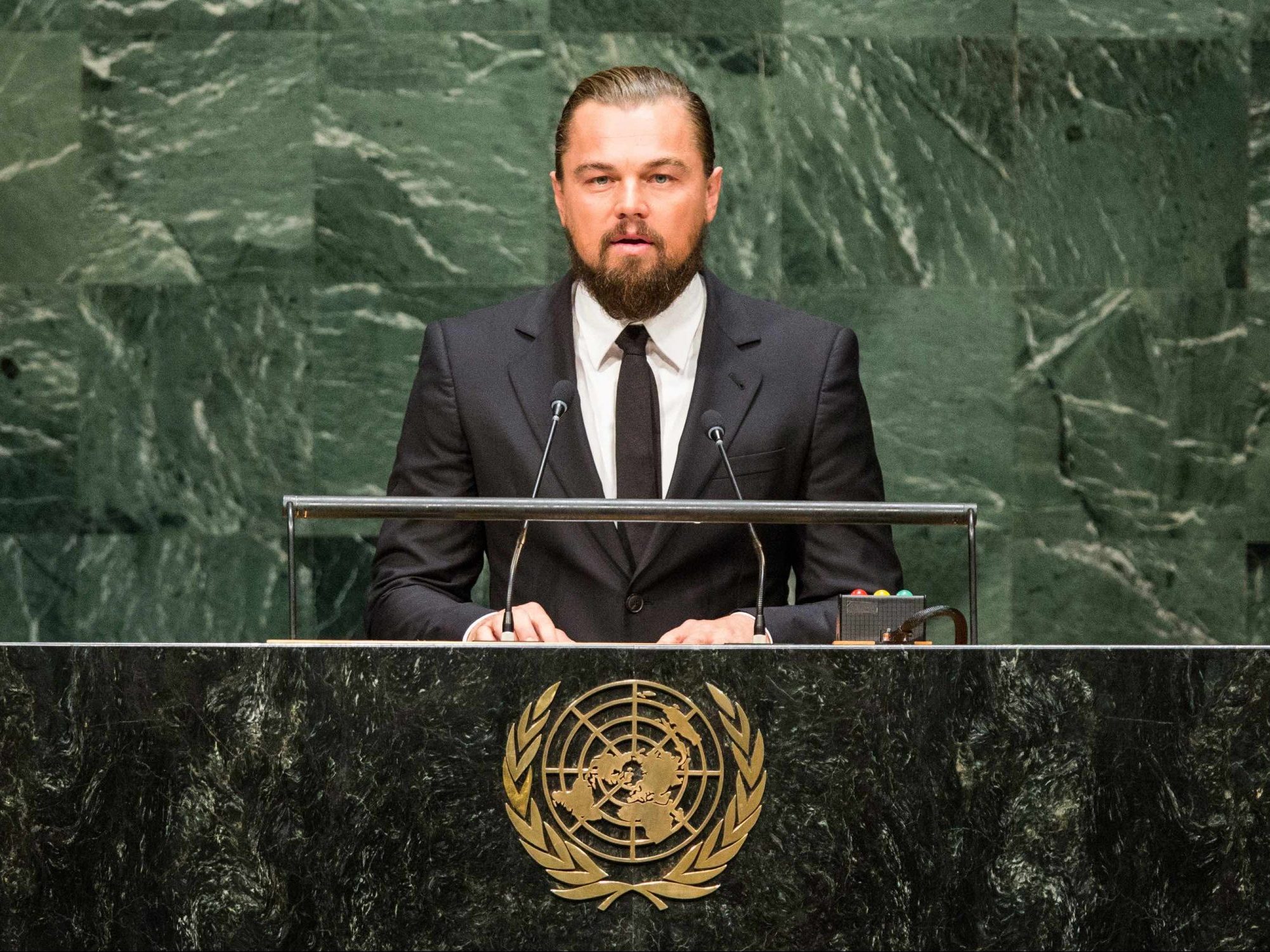 As Leonardo DiCaprio’s leading-man gigs have grown fewer and farther between over the years, he’s committed more of his time to environmental preservation. The photo above depicts the A‑list heartthrob-turned-activist speaking to the UN about the paramount importance of protecting the planet, part of a wider effort that’s also involved producing and narrating documentaries to this same effect.