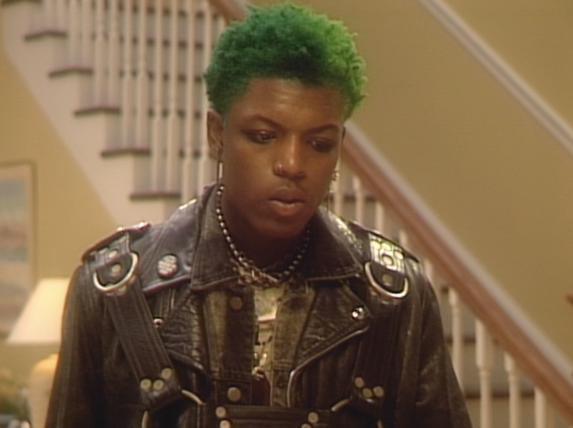 As if in a pan-and-scanned dream, we zip through footage of an internally tormented monkey, a hooded crone in unsettling pursuit, and a Fresh Prince-style multi-camera sitcom with a green-haired punk in the Will Smith role.