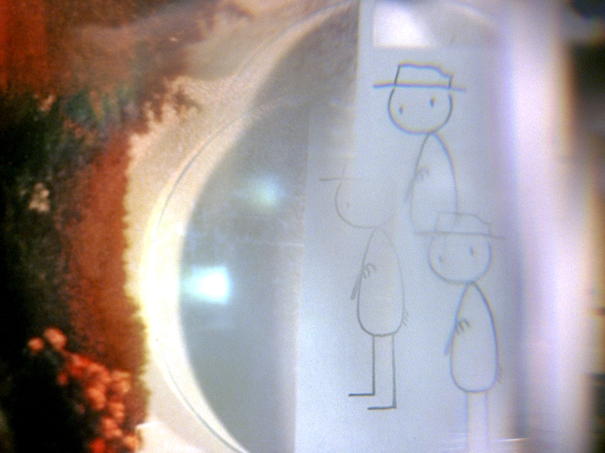 for early shorts like “rejected” i was still using the camera in a very straightforward way. but at a certain point i realized, hey you know what, this animation motor goes both forwards and backwards. you could shoot something, then run the film backwards with the shutter closed, and then expose that same piece of film again. you’re shooting blindly with no video playback, but you can try to keep track of where you’re at on the roll of film with a frame counter. it wasn’t high tech but i began trying out some multiple exposures for the first time with a short called “the meaning of life”. it was mainly for straight special effects stuff, like compositing different moving lights together. when i was first developing “everything will be ok”, i couldn’t crack the story for a while because i couldn’t picture it yet. the camera was very bulky and limiting, it was kind of annoying and cumbersome just to shoot a zoom or a tracking shot, so the cartoons often felt very static. i also didn’t want to literally show a city when bill’s walking around. the picture needed to be more impressionistic and sensory, since it all takes place in his head.
