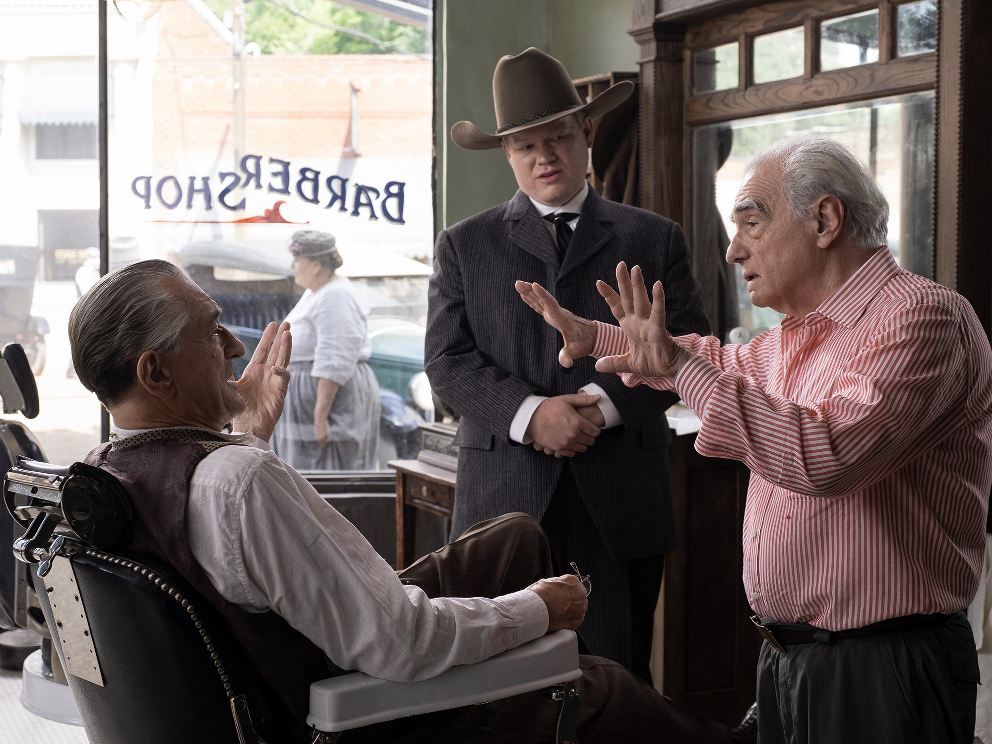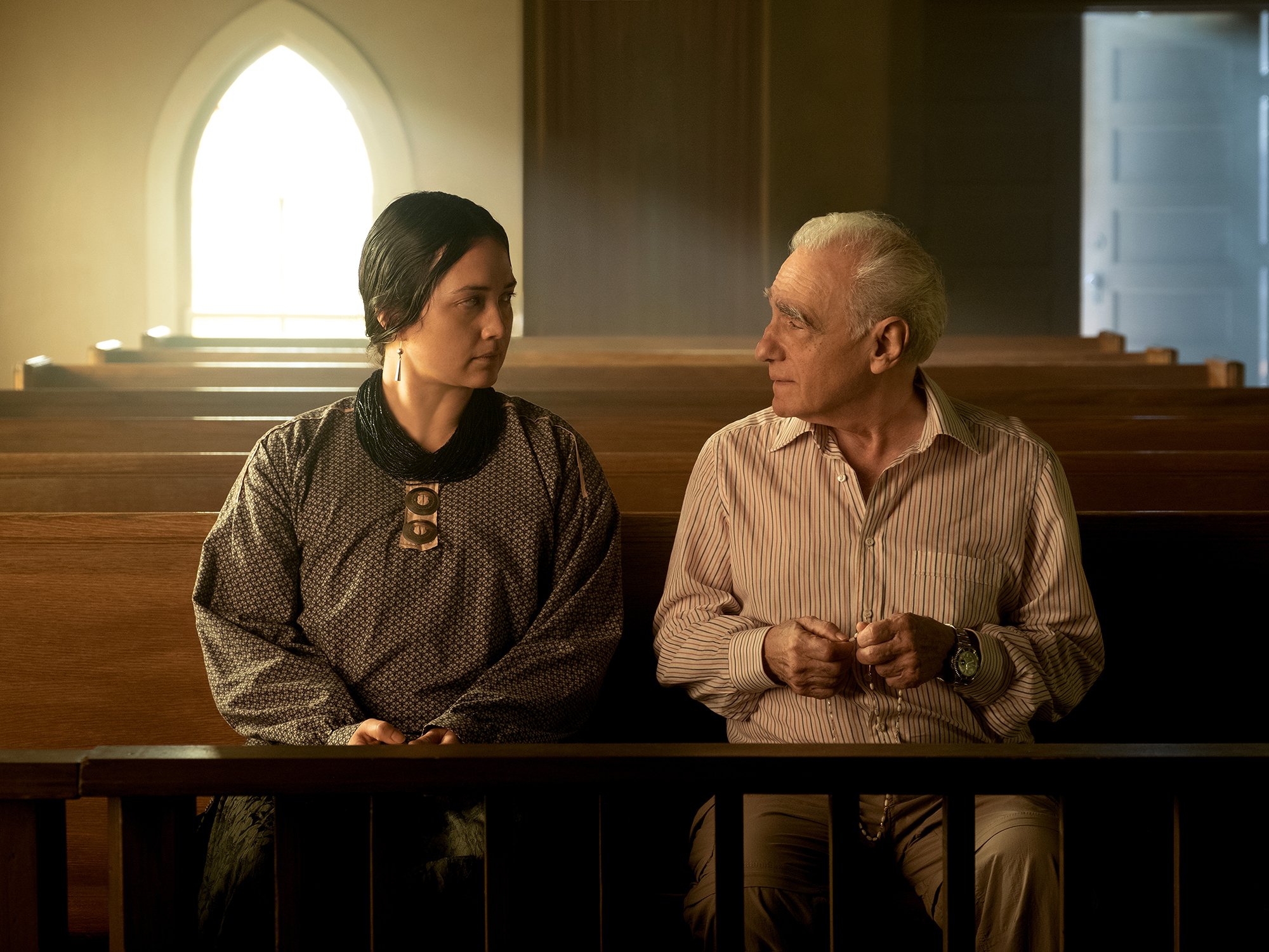 That was the constant: historically accurate. Or, truthful. We had a lot of support from the Osage authority, the experts who were giving us indications of how to go about these things. Johnny Williams, and a number of other people. We tested the accuracy of the rituals, the baby namings, the wedding, the funerals. In some cases, there was wiggle room because honestly, the last two generations of Osage were taken out of their experiences because they had to become White European. They had to become Christians, Catholics, whatever. But in fact, now there’s a new resurgence of learning the language. And we had language teachers there, and Lily Gladstone, Leo, and De Niro learned the language. De Niro really fell in love with it, and wanted to do more scenes in Osage. So they were learning to put their culture back together again through this movie, and we were going with them.