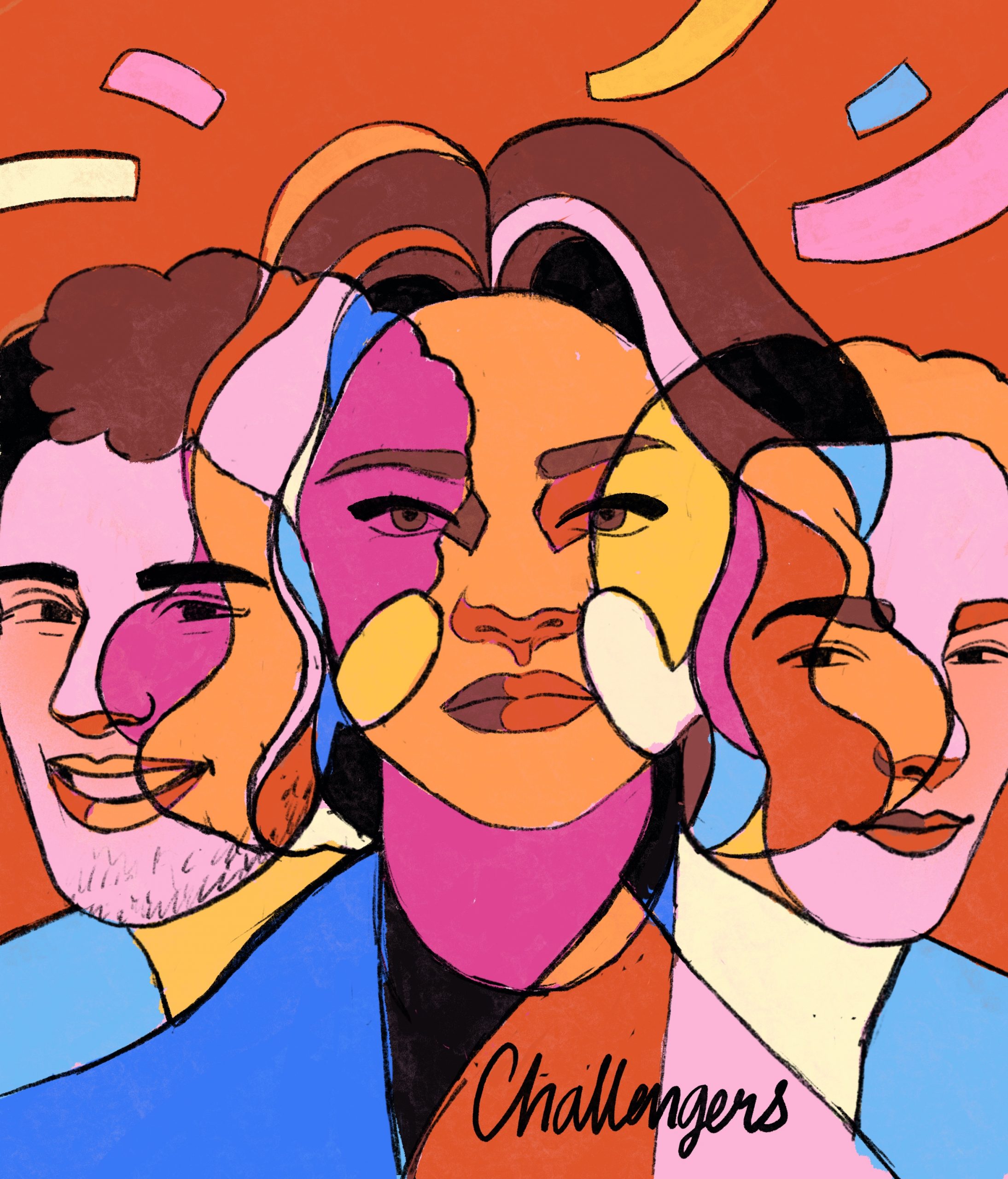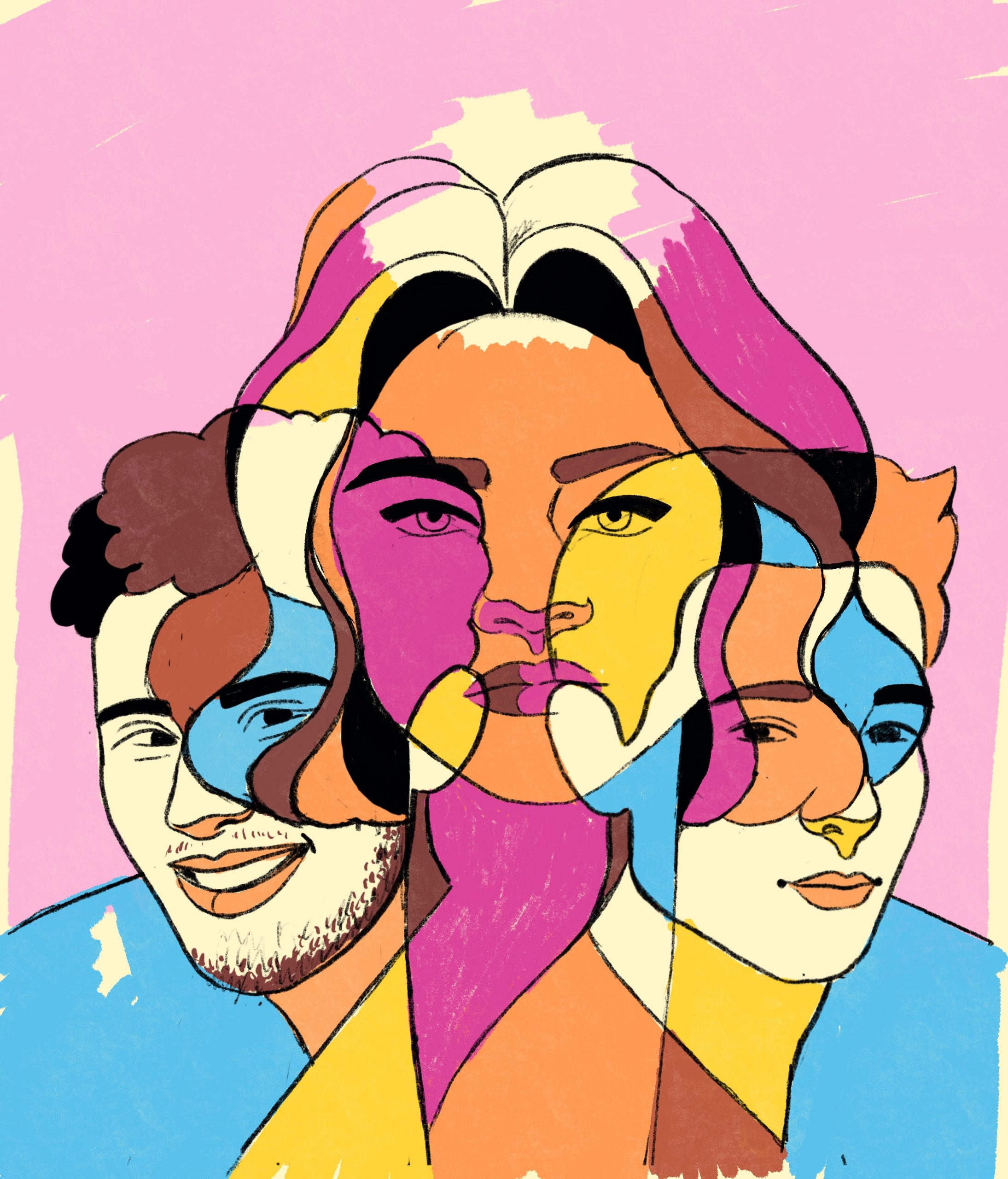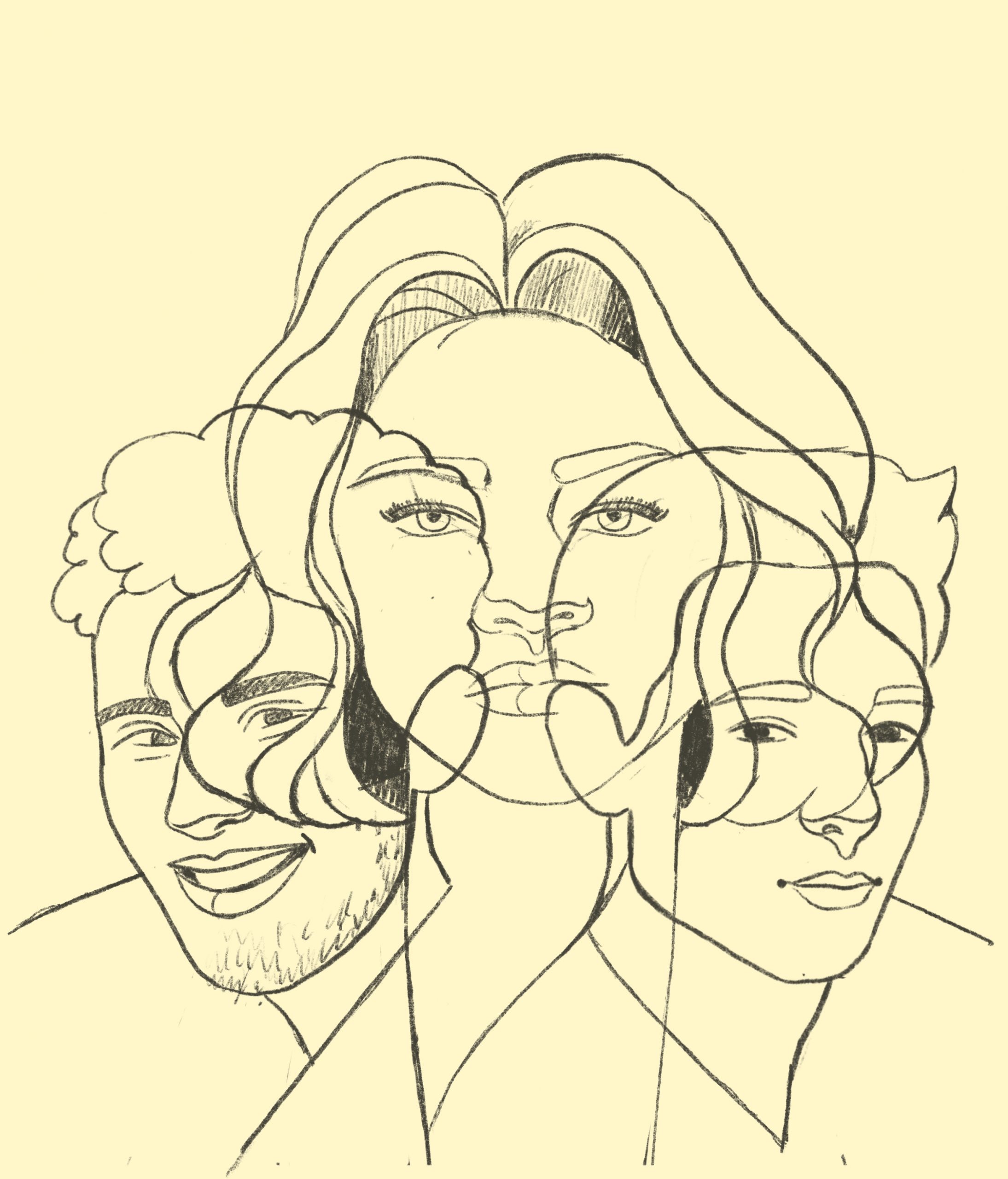 Getting the likeness right can be really tricky, especially in these overlapping portraits where a lot of things need to be simplified and where the overlapping shapes themselves can take away from the likeness of a person. To try to get it as good as possible I look at many photos of the people, ideally photos from different angles to find specific details in their facial features and expressions that will help. Specifically I’m looking at the shape of the eyes, nose, mouth, eyebrows and dimples or how their face changes when they smile etc. I find that if I get these things right that helps a lot with creating an overall likeness.
