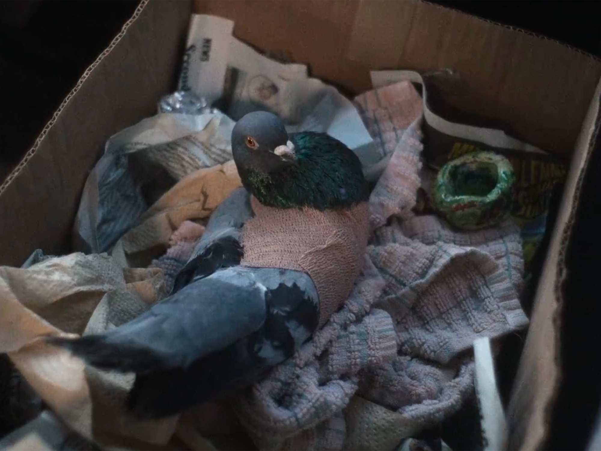 Showing Up expands Reichardt’s animal menagerie to include two new animal protagonists – the tomcat Ricky and the injured pigeon. Ricky (in fact played by two feline actors) is akin to Lucy the dog – a loyal companion of a lone artist (a trope long noticed in popular culture). The avian character, on the other hand, omnipresent in Reichardt’s other films, moves from the periphery to the centre for the first time. There is a potent sense of parity between the wounded pigeon and the sculptor; the parity between nonhuman and human lives.