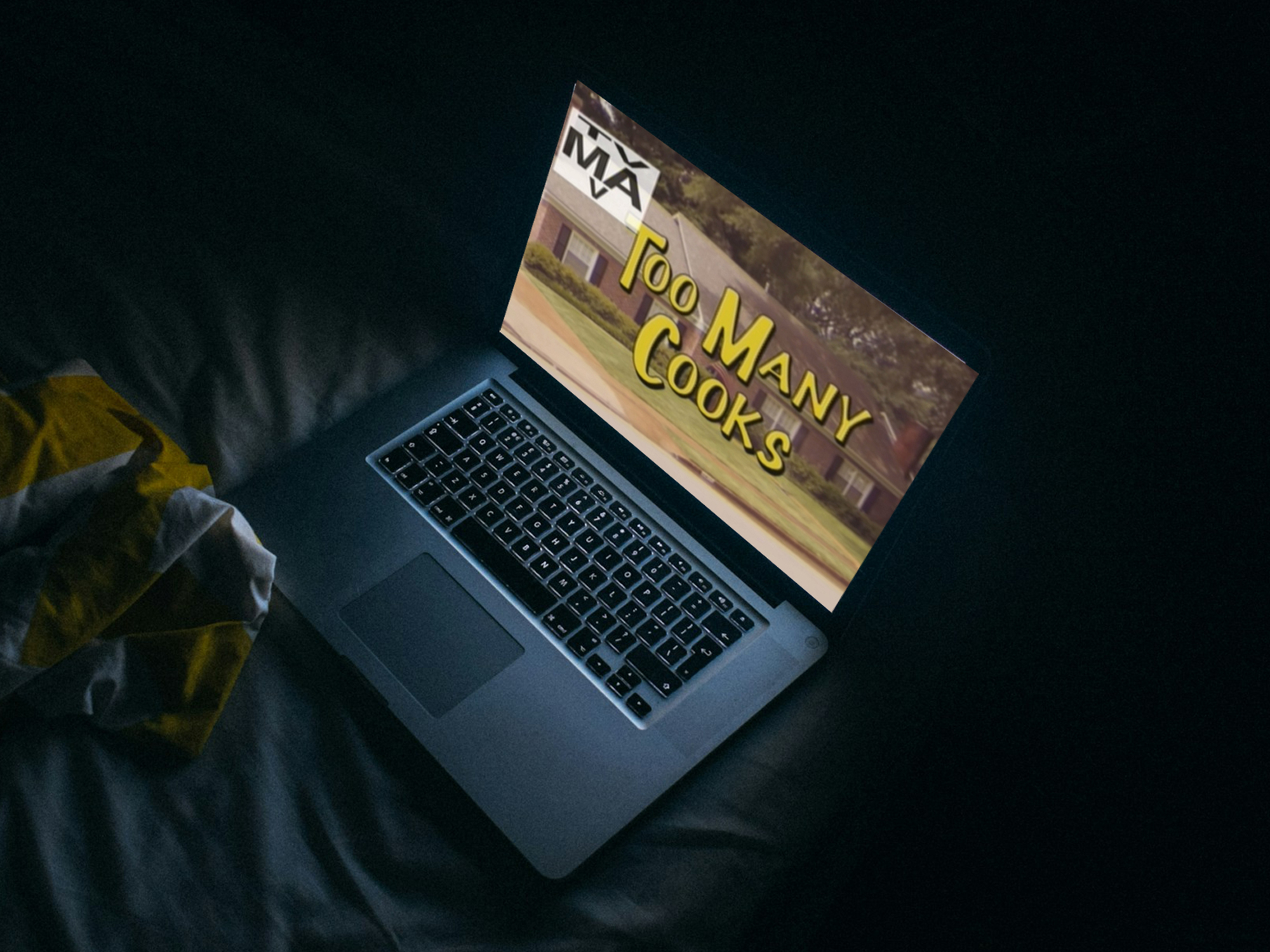 In one of the many riffs and remixes of the opening titles to Too Many Cooks, a young woman breaks out of her sitcom and runs through backstage corridors, moving past two doctors as she does so. The two doctors are treating a man who lives inside the Too Many Cooks sitcom – his name and character appear across his body in yellow text – and they can hear the theme song playing when they use a stethoscope on him. As they spend more time exposed to this theme (this meme) it sinks its claws into them and they look out to the camera, forced into the faux smile of a sitcom character, as the refrain plays out again and again: “too many cooks / too many cooks.”