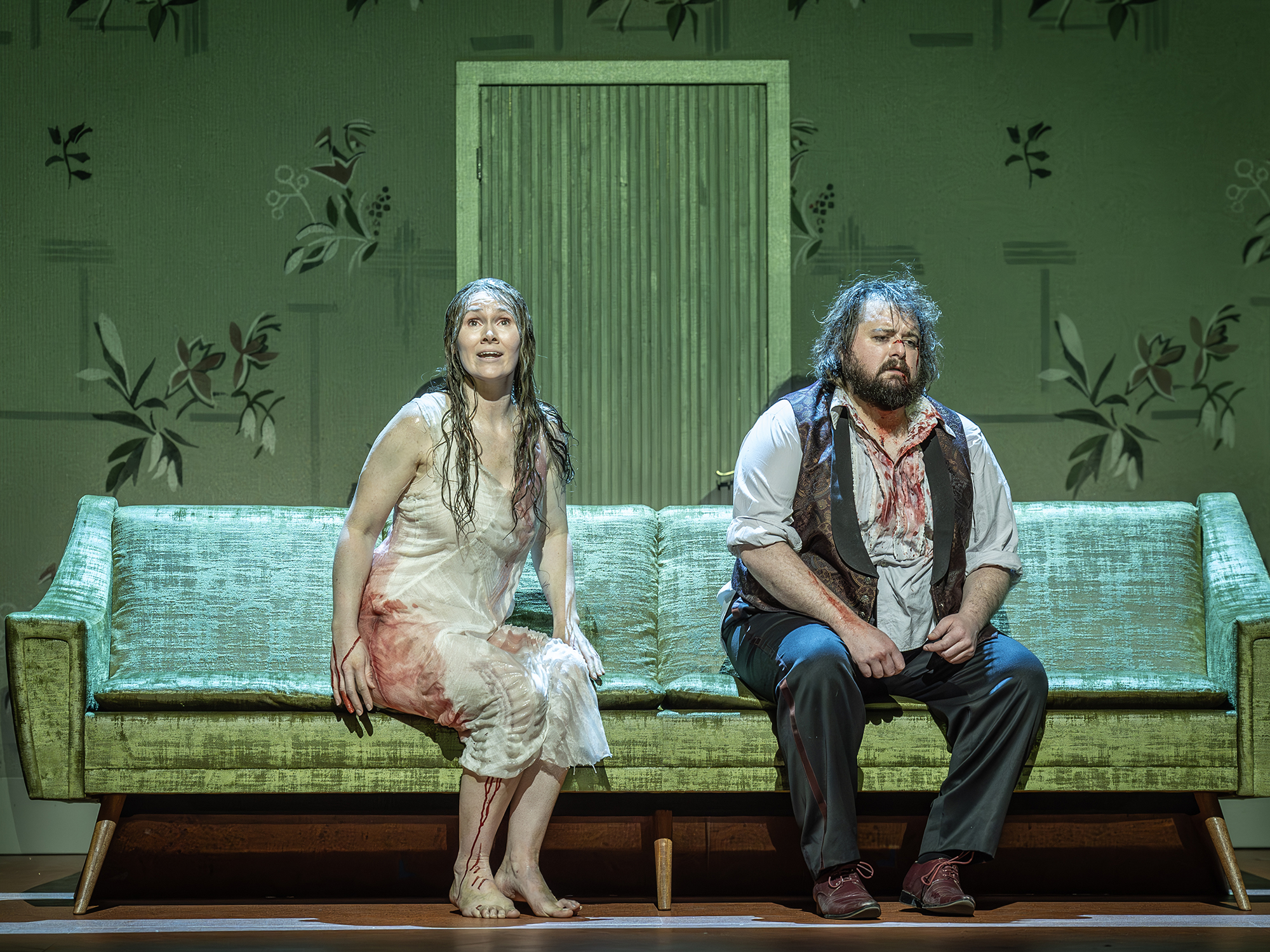 This revelation is upsetting and discomfiting enough in words alone, but it’s heightened through form. In Vinterberg’s film, cinematographer Anthony Dodd-Mantle captures Christian’s pained face (and the comparably stoic faces of the onlookers) in claustrophobic close-up. The Dogme manifesto’s insistence on handheld cinematography renders these framings unavoidably shaky, destabilised, as we hone in on the family’s cracks, tics, and tells. The vastness of the Royal Opera House’s auditorium forces a different visual approach. “We’re on a big stage, so everything has to be bigger.” says Natalya Romaniw, who plays Helene. “If we tried to be as intimate with our actions and our responses, then it wouldn’t read in a big house”. The exaggerated gestures of the performers are similarly destabilising of the reserved decorum the dinner party demands, bringing these bitingly raw words to life with a physicality impassioned enough to capture them.