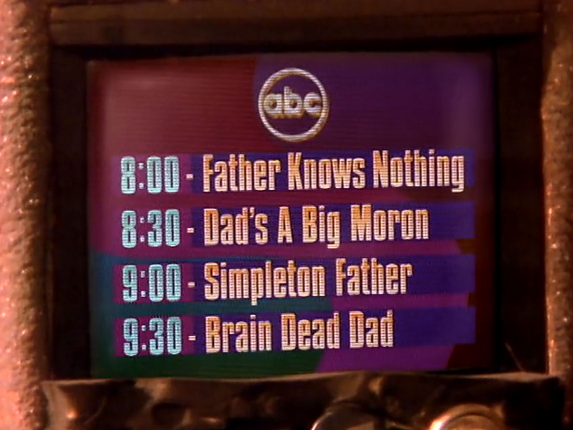 Another way in which Dinosaurs tapped the early ’90s zeitgeist was by gutting the ‘wholesome ’50s father’ archetype. Upstanding dads had dominated sitcoms (subgenus: comedie domesticus, or ‘dom coms’) from Father Knows Best to The Cosby Show. Full of beer nuts and hot air, Earl (voiced by Stuart Pankin) inherited the ‘bad dad’ mantle from Alf Garnett (Till Death Us Do Part) and Archie Bunker (All in the Family), whose parenting deficits were honoured such ‘dumb dad’ renaissance texts as Married… with Children, The Simpsons and Home Improvement. Dinosaurs even skewered the trend with this facetious weeknight line-up: