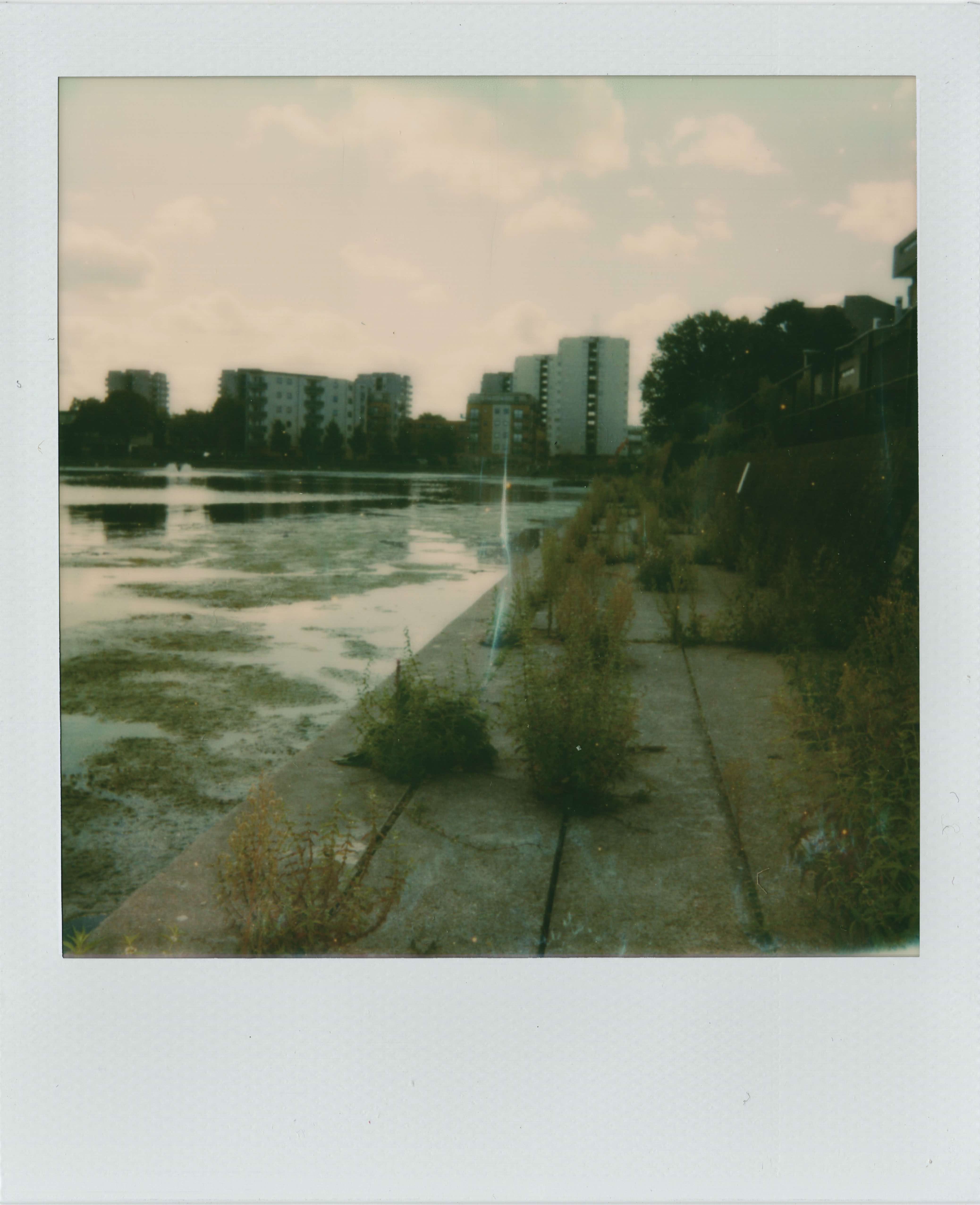 All of the entranceways are closed off, with only one opening left where the bins were once kept, now occupied by a few homeless people. Walking to the other side of the marina, a blue wooden panel blocked off access but was easy to bypass. The contrast between Kubrick’s images and the building today is surreal. Whereas the Droogs walked on pristine concrete, the pathway is now overgrown with weeds. And with the adjacent marina covered in algae, the whole area feels more like JG Ballard’s ‘The Drowned World’ than Burgess’ novel. The building which originally stood in the background has already been demolished, so taking a photograph is to capture only a fragment of how it looked to Kubrick’s eye.