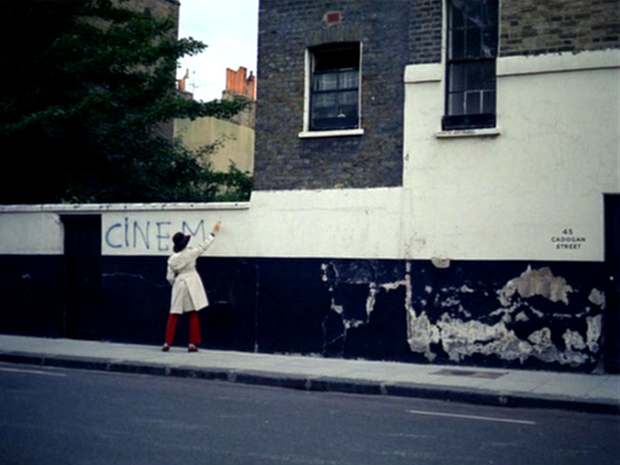 Though this occurs a number of times in a range of different locations, the one that sticks out for me is also one of the shortest. In the middle of the segment at Lombard Wharf, Godard cuts to a graffiti sequence on a white wall somewhere in the city. Eve Democracy writes “cinema” in black paint before Godard cuts abruptly, almost as if they were discovered and had to stop filming. It may have been an attempt at writing “cinemarxist” – something successfully achieved later on a piece of fence in Hackney – but it’s impossible to say. More intriguing is that it is the only segment and wall that has an address seen on it, 45 Cadogan Street visible on the wall near the door.