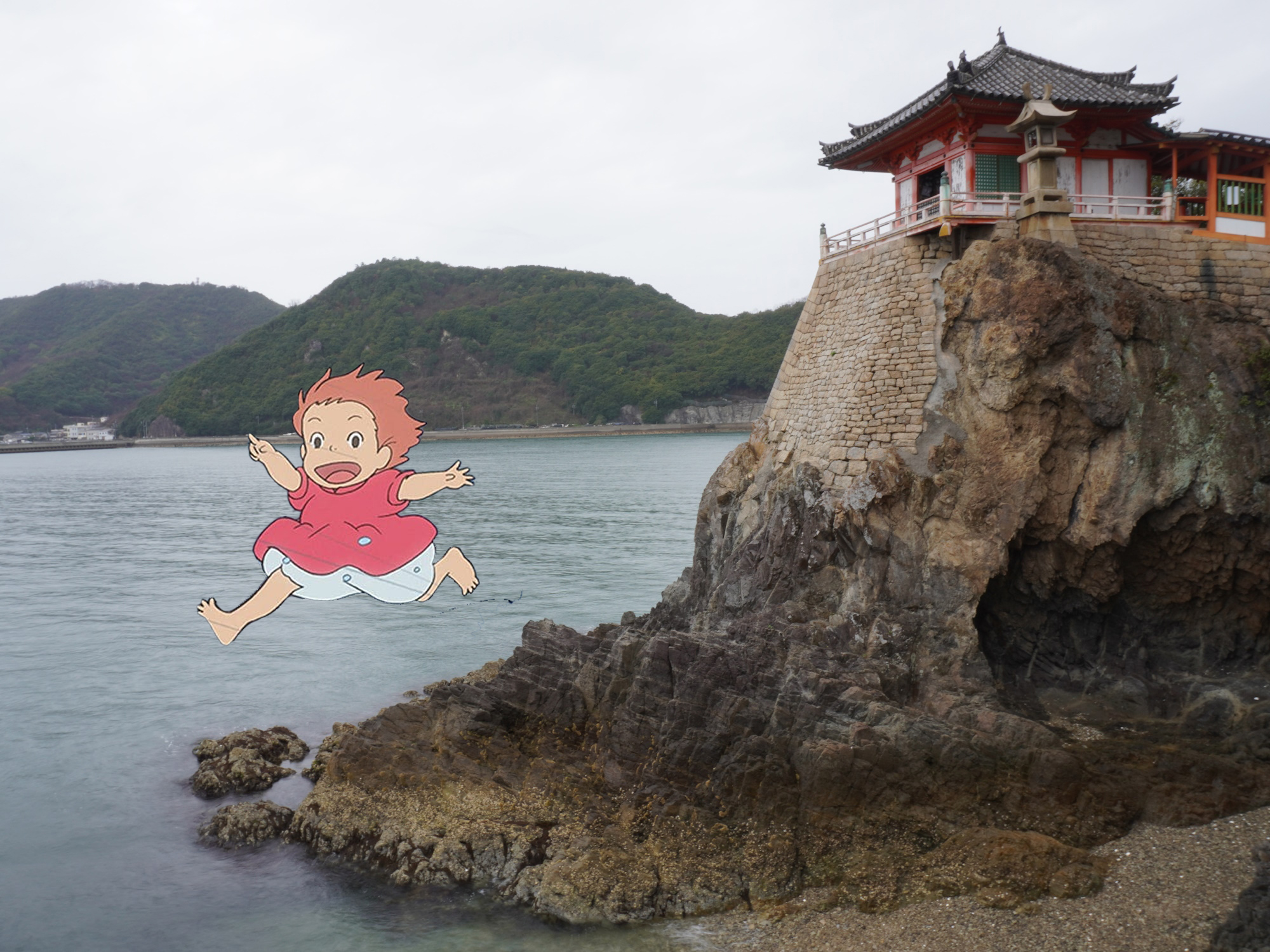 And then, driving just a few minutes more on the other side, the Abuto Kannon where sailors have prayed to the Goddess of Mercy for over a millennium. As the striking Buddhist temple stands sentry, jutting out from a headland over the Seto Inland Sea, it’s only a minnow-sized stretch to associate its crimson lacquered façade with the fiery locks of Granmamare – Ponyo’s matriarchal sea deity. And it’s her serene, compassionate beauty that perhaps gives the most revealing clues as to the streams in Miyazaki’s mind where Ponyo and Tomonoura meet.