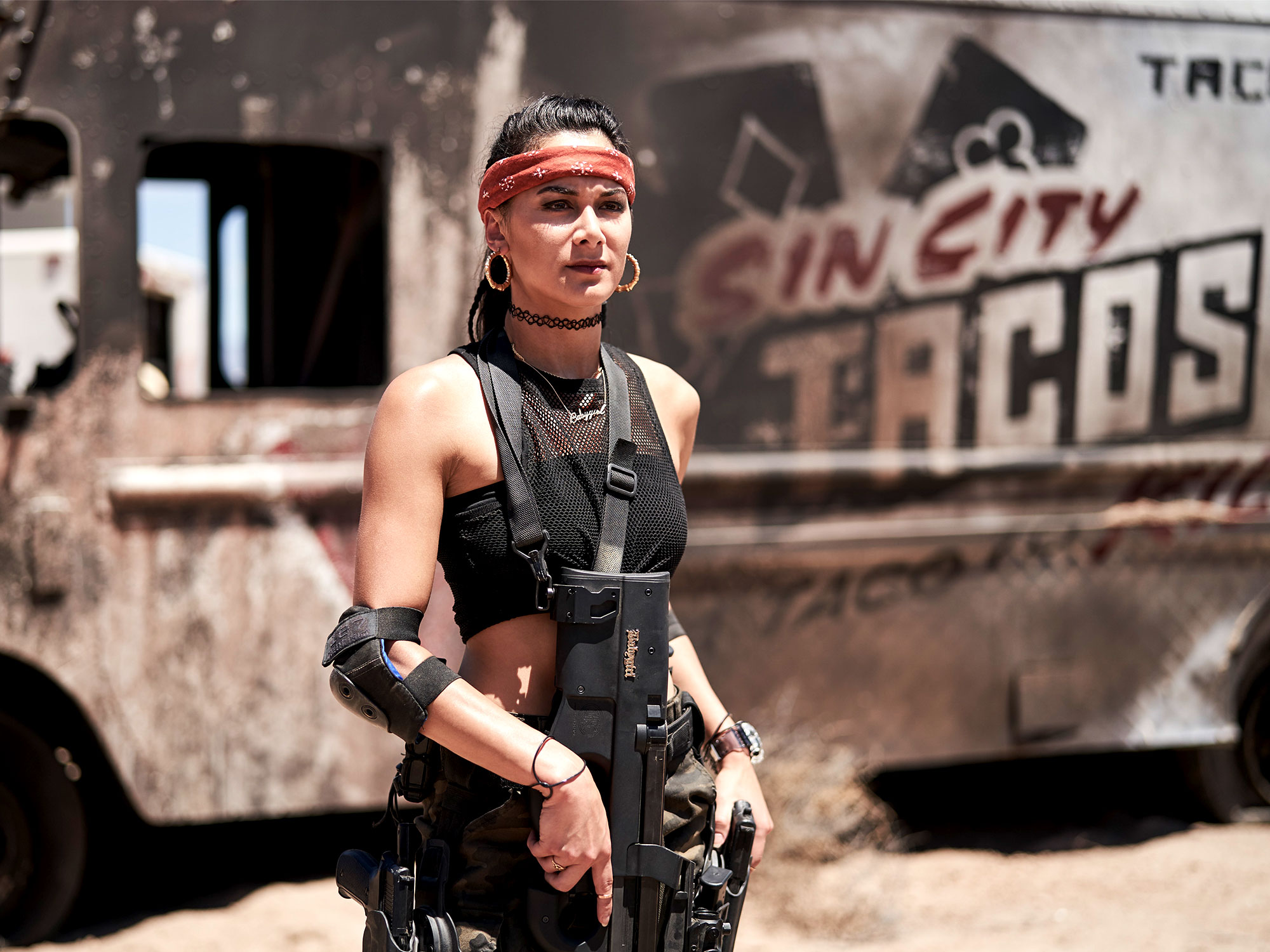 There’s Vanderohe (Omari Hardwick), a former philosopher turned soldier; Cruz (Ana de la Reguera), a friend of Ward’s; Ludwig Dieter (Matthias Schweighofer), an eccentric German safecracker; Marianne Peters (Tig Notaro), a pilot; Mikey Guzman (Raul Castillo), a sharp-shooter with a YouTube channel where he kills zombies; and Lily (Nora Arnezeder), who has a reputation for getting people in and out of the walled city. They’re joined by two villains: Martin (Garret Dillahunt), Tanaka’s Head of Security, and Burt Cummings (Theo Rossi), a sadistic guard from the refugee camp.