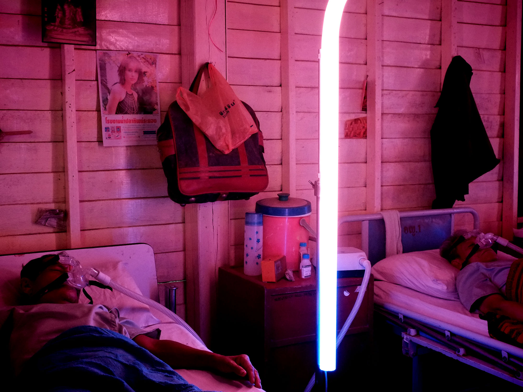 Joe’s regular star Jenjira Pongpas (please, call her Jen) is back once again, on call as a spirit amanuensis that helps comatose soldiers communicate with their loved ones. There is a plot, but it’s typically hard to summarise; per semi-usual, there are casual encounters with amiable spirits in human form and a scene of group outdoor exercising to peppy music. The major new visual additions are the glowing tubes installed over the soldiers’ beds; slowly transitioning from strong reds to intense blues and verdant greens, they’re supposed to aid sleep. Positioned at equal distances from each other, they’re an eerily shaded internal forest analogous to the one outside.