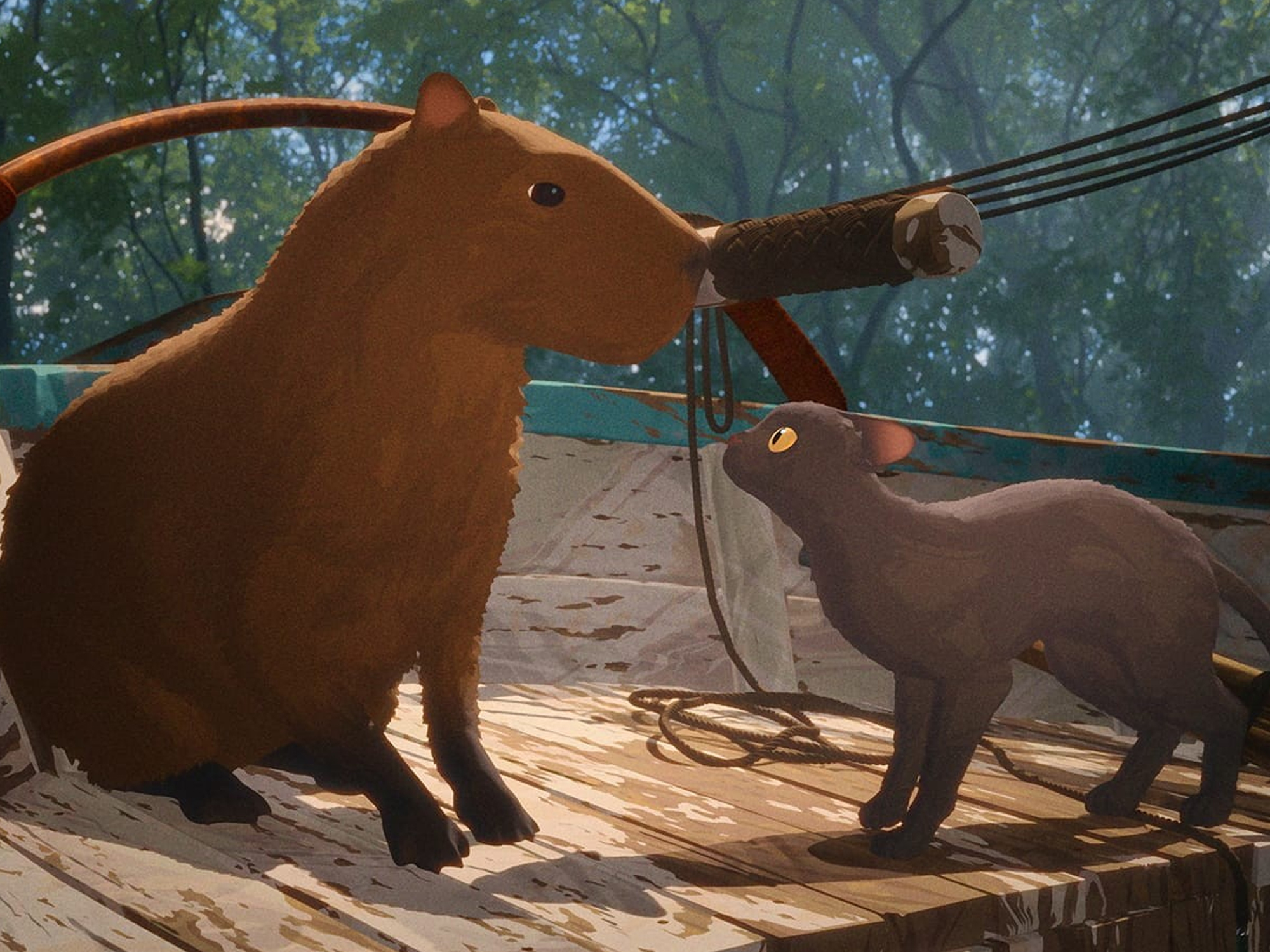 If there is a cat in your animated film, conventional wisdom dictates that it must be wisecracking, aloof, and preferably voiced by a B‑list celebrity. Even the adorable moggies at the heart of many Studio Ghibli properties can’t escape the Cattitude Curse that has long plagued our feline friends in film – but there’s a disruptor in our midst. In his second feature film, which took five and a half years to make using open source software Blender, Gints Zilbalodis centers a small grey cat who doesn’t utter a single word. Neither do his crew mates (a capybara, a dog, a secretarybird and a ring-tailed lemur) on the small boat they find themselves travelling in after a great flood turns the land into an ocean. Instead the cat meows, the dog barks, the bird squawks and the lemur chitters (the capybara is actually voiced by a baby camel as Zilbalodis worried audiences would find actual capybara sounds offputting) as their quintet attempts to navigate a brave new world.