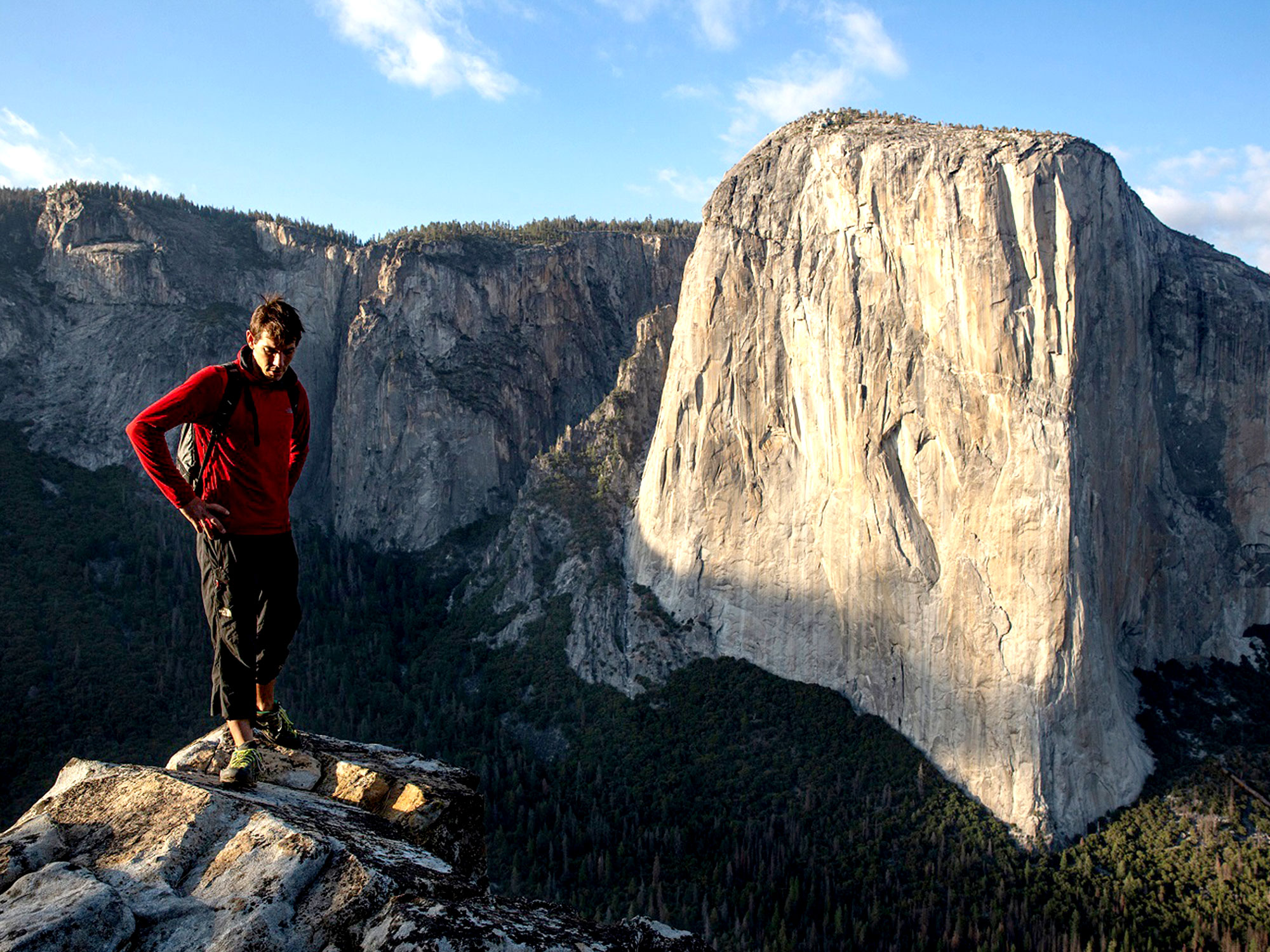 Recording also creates an intriguing conflict: could the crew’s presence be the true catalyst for Honnold’s angst? What’s the point of filming this feat if, becoming cognisant of a camera, our subject loses his foothold? At the pinnacle of narrative tension, with Honnold halfway up El Capitan, a drone-mounted camera leaves the man behind, and rises up to reveal the environmental splendour and terror that envelop him. As the dire possibilities of one misplaced finger sink in, Honnold’s lone red t‑shirt disappears from view, a blip in the history of civilisation. Yet still he clings.