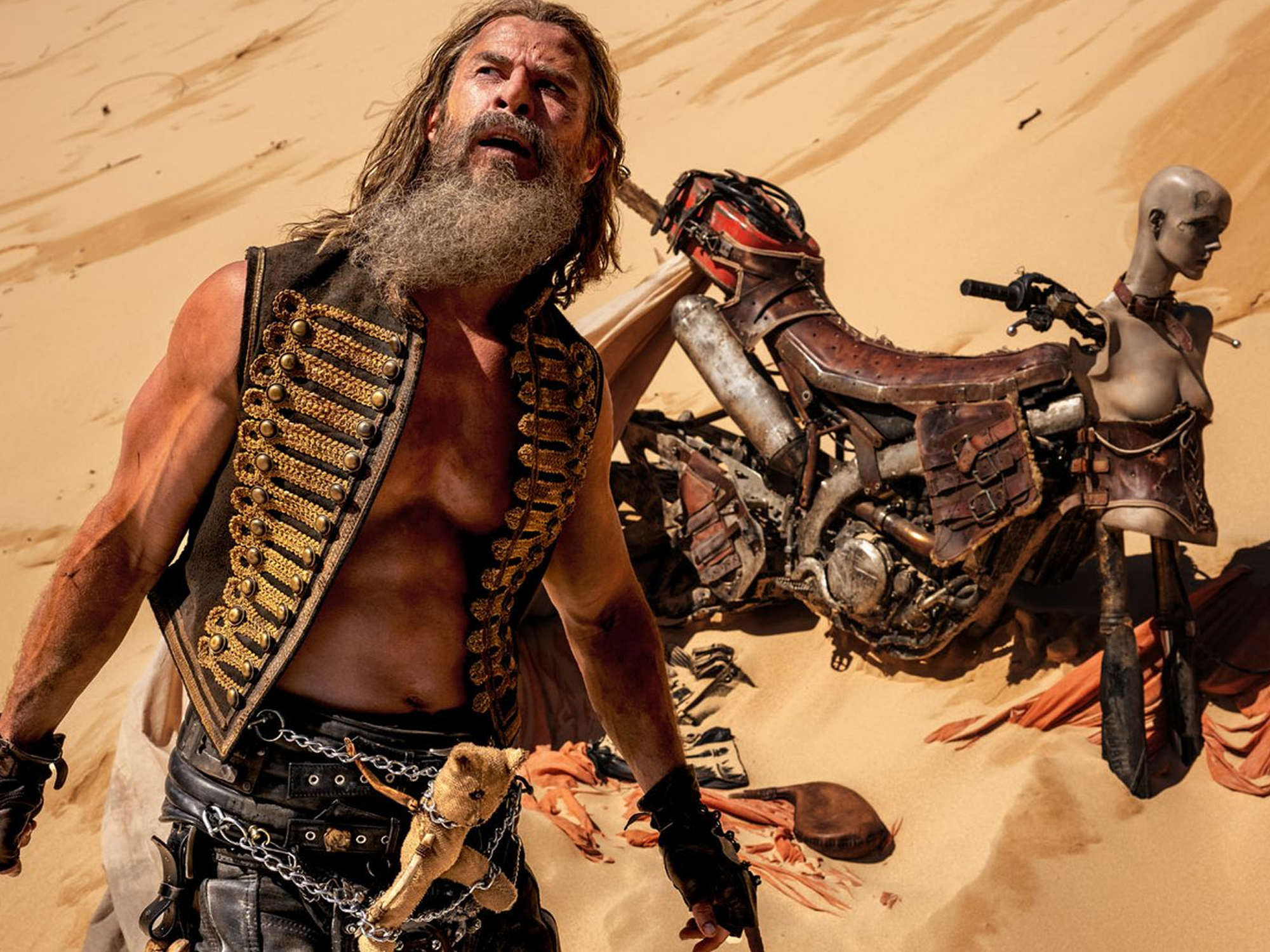 The story begins in the fabled Green Place, where Furiosa was raised by a female collective known as the Many Mothers or the Vuvalini, who had weathered the global collapse to create a lush commune, complete with solar and wind power, plentiful crops and a supply of fresh water. Crucially, the place is kept secret, lest it fall to the tribes of ravenous scoundrels who roam the wastes like locusts, keen to pick every scrap of meat from the bone. A young Furiosa (played in early scenes by Alyla Browne) is kidnapped by one such gang, who realise they can use her to impress their deranged leader Dementus (Chris Hemsworth), a self-styled legionnaire who commands a chariot powered by two motorbikes, and leads a hoard of leathered loons across the land. This doesn’t quite go to plan, as they are pursued by Furiosa’s equally ferocious mother (Charlee Fraser), but – as Fury Road viewers may remember – this rescue attempt has a rather tragic ending.