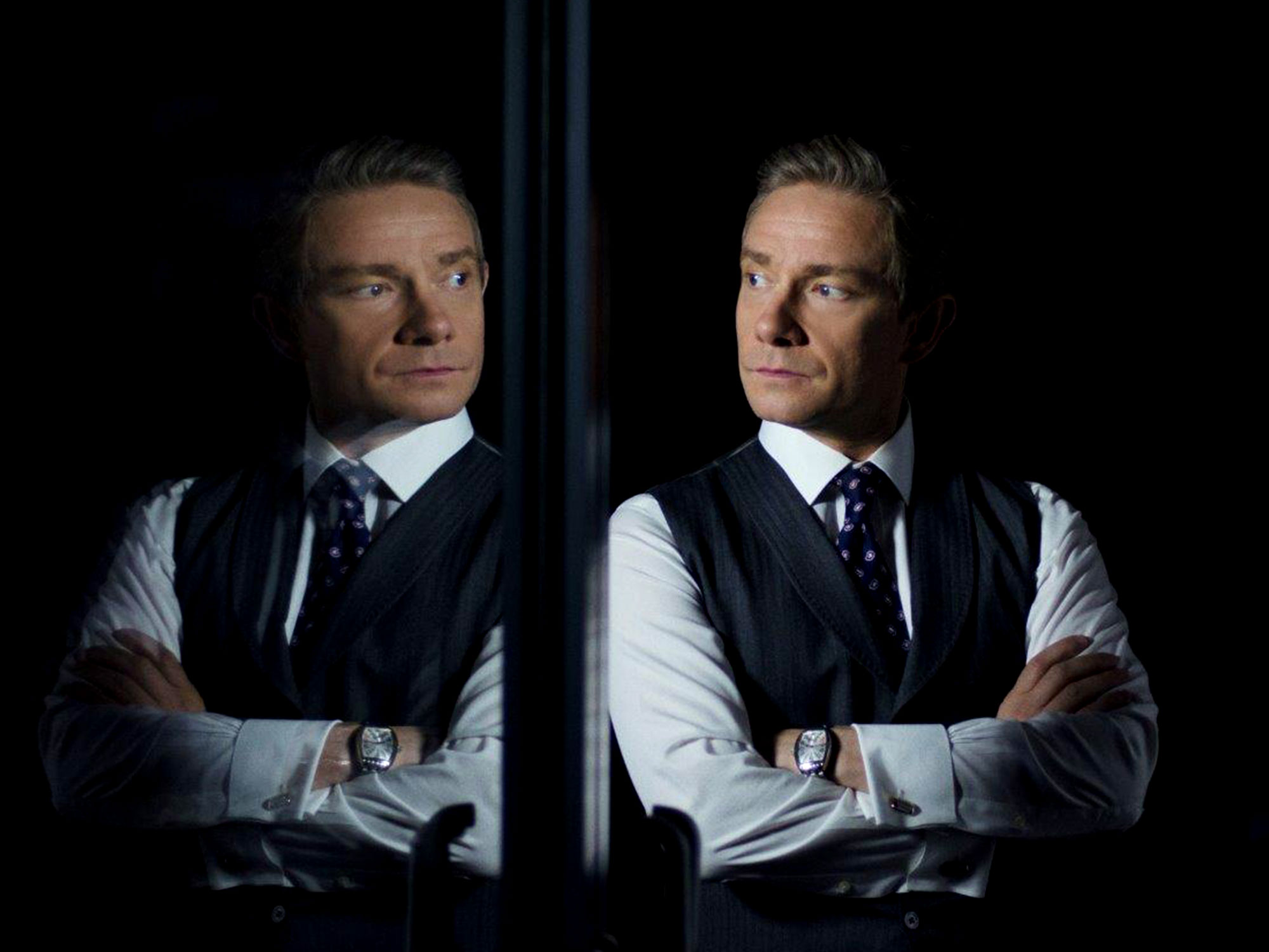 There’s humour among all the tragedy but Dyson and Nyman don’t overplay it. The camera is continually poked into Lawther’s pained expressions as he contorts his face under spooky red lights and the darkness of winding country lanes. Lawther’s face in these unbearably tense scenes resembles Maxwell Frere’s ventriloquist’s dummy in Dead of Night and also brings to mind Michael Redgrave’s affecting performance in the same film. Finally, Goodman convenes with flat-cap wearing businessman, Mike Priddle (Martin Freeman) in a vast, empty field where he is desperately searching for his hunting rifle.