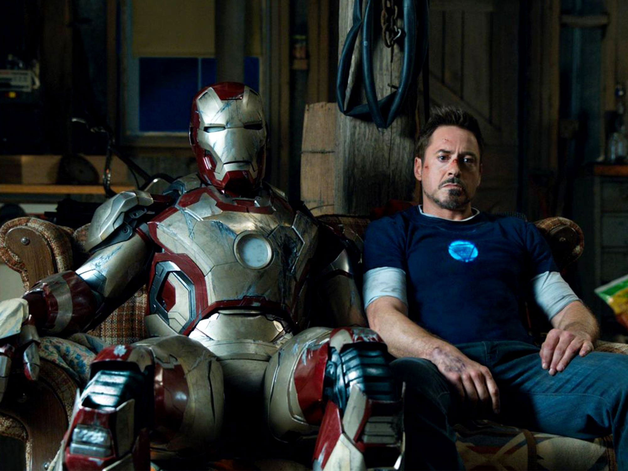 Near the beginning of his film, Stark leaves his suit in the parking bay of a surf ‘n’ turf shitbox like some busted old dirt bike. He finds his purpose once more when he’s forced to construct a superhero suit from the products purchased at a hardware store. Iron Man 3 sets out a simple stall: The good guy is stripped of his protection, of his wife and of his will to work as a superhero. The bad guy is clouded in layers of media managed obfuscation and techno fuzz. Shane Black finds a way to give us a rich guy we can root for.