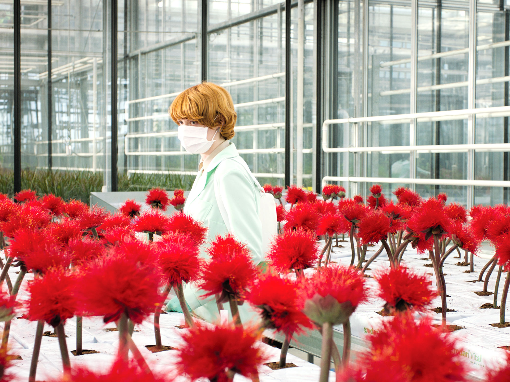 Actor Emily Beecham is styled to resemble an exotic flower in Jessica Hausner’s acetic paranoid psychodrama Little Joe. Her hair is formed into an opulent orange bouffant, and she scurries around her laboratory in an eerie mint-green lab coat which looks like a stamen.