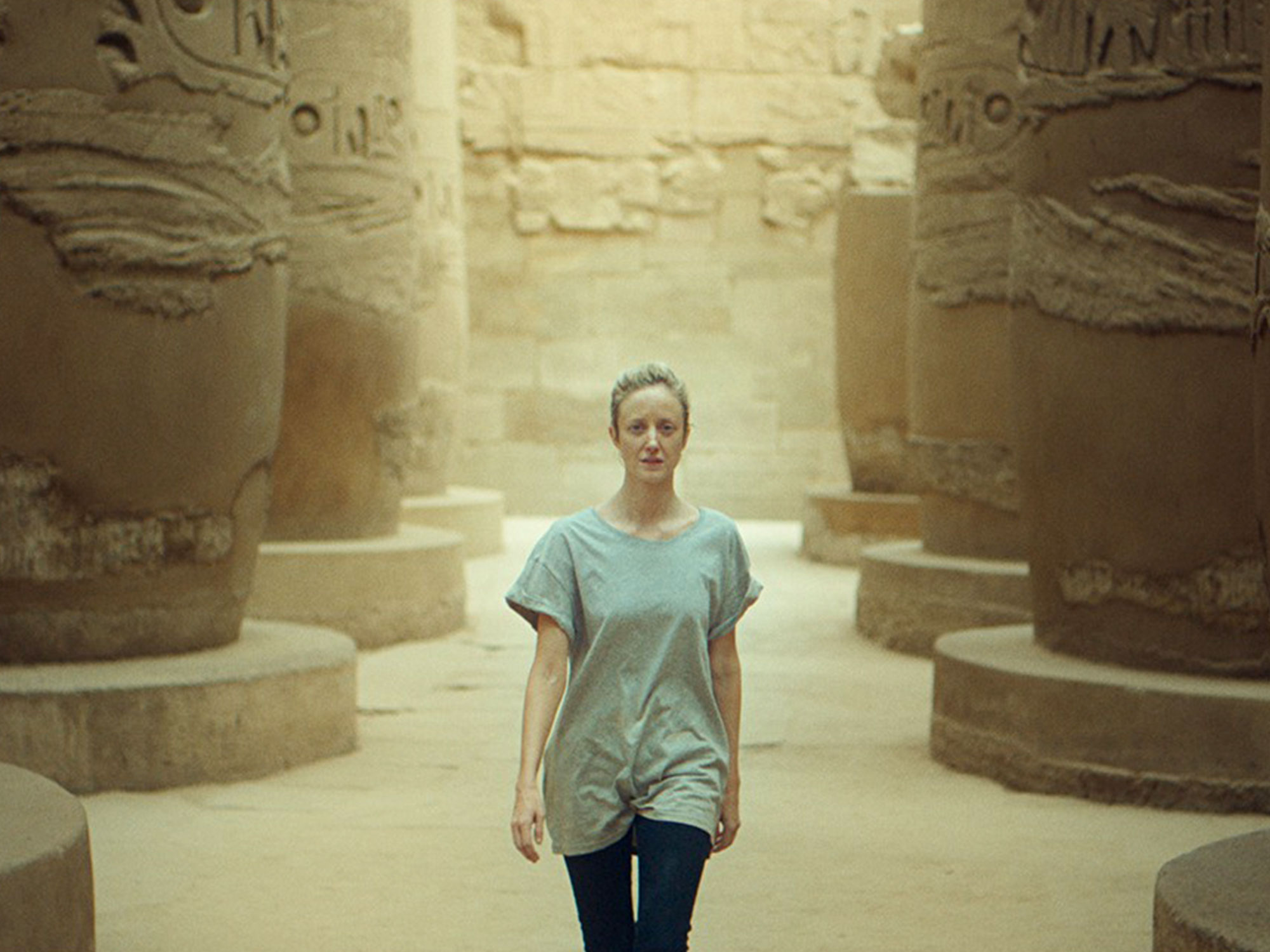 Drifting on the banks of the Nile in the eponymous city, Luxor revolves around Hana (Andrea Riseborough), a mysterious traveller returning after years away. At first she’s engulfed: a guest checking into a high-ceilinged hotel; a figure in light cotton lost in front of a mural of excited Egyptian figures; a loner following an eager huddle of tourists being guided around some temples.