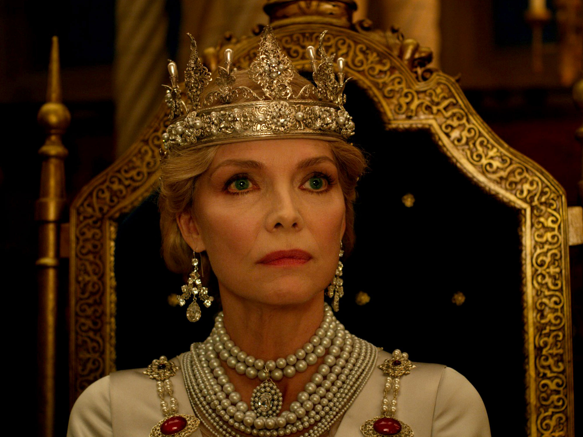 When Prince Philip (now played by Harris Dickinson), after waiting five whole years for some undisclosed reason, finally asks Aurora for her hand, Maleficent is invited to meet the family and the temperamental creature tries her best to be agreeable. But she finds good reason to be upset when soon-to-be mother-in-law Queen Ingrith (Michelle Pfeiffer) threatens to take Aurora away from her.