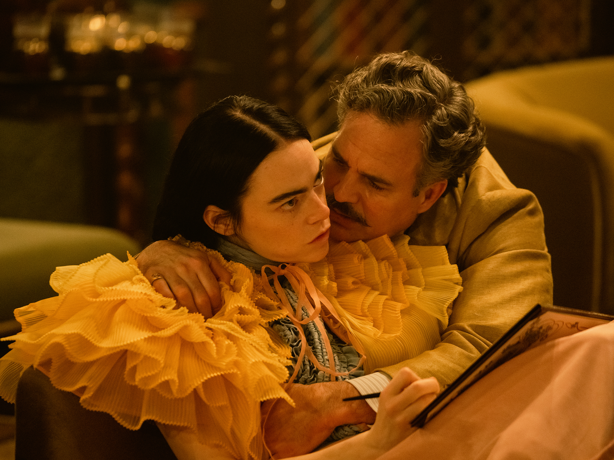 Her autonomy is realised through language and orgasms, and in her case, they go hand in hand. When Bella decides to leave the confines of Baxter’s home, she knows all too well what to expect from a debaucherous trip with famed seducer Duncan Wedderburn (Mark Ruffalo, who oscillates between ruinous to gloriously sullen). For her, sex is a morally neutral act and pleasure a key for a good life. Jealousy and monogamy are nonsensical concepts she cannot name, and the fantasmatic iterations of what she calls “furious jumping” (has there ever been a phrase more accurate?) she and Duncan engage in, exemplify how her fresh perspective descales heterosexual relationships out of their pernicious moralism. By making her desires known, heard, and fulfilled, Bella slips into a dominating role quite easily because she hasn’t been taught subjugation – a hope for women of the future, unburdened.