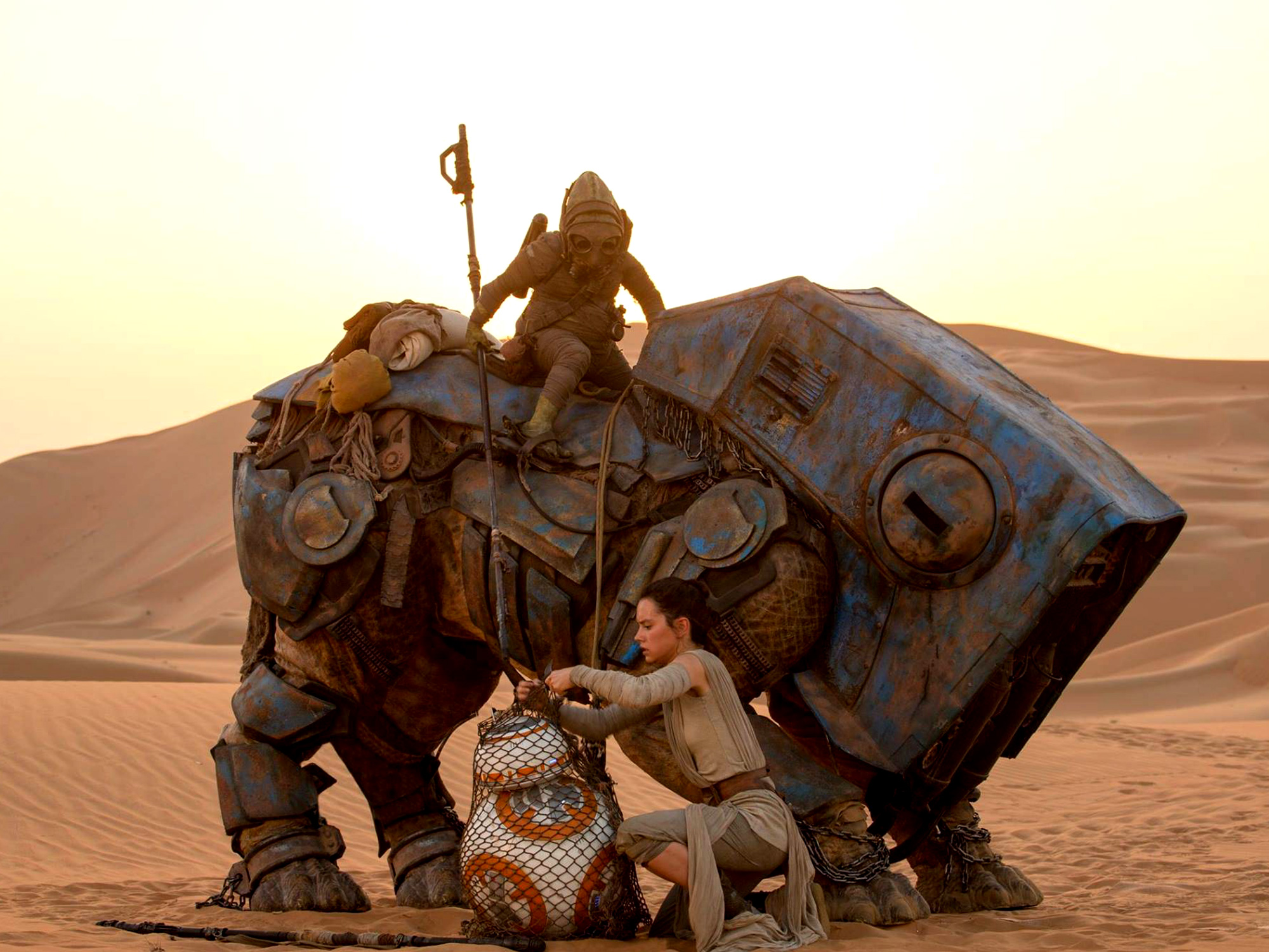 This ornery Star Wars naysayer is overjoyed to admit that The Force Awakens is liberally strewn with beautiful moments. Two of the most beautiful occur when a character comes into physical contact with an object which sends their mind reeling into paroxysms of barely-suppressed delight. Solitary scrap scavenger Rey (Daisy Ridley, who really is The One) is propped up against the husk of a burnt-out craft which is semi buried in the sand. She picks up a battered old fighter pilot’s helmet and places it on her head. The camera lingers. One beat. Two beats. No plot. No action. No words. Sure, it’s a basic visual shorthand expressing Rey’s dormant aviatrix aspirations, but it’s also an extremely poignant touch which emphasises that she’s maybe missed that time of high adventure when worlds were forged and destroyed in the sky.