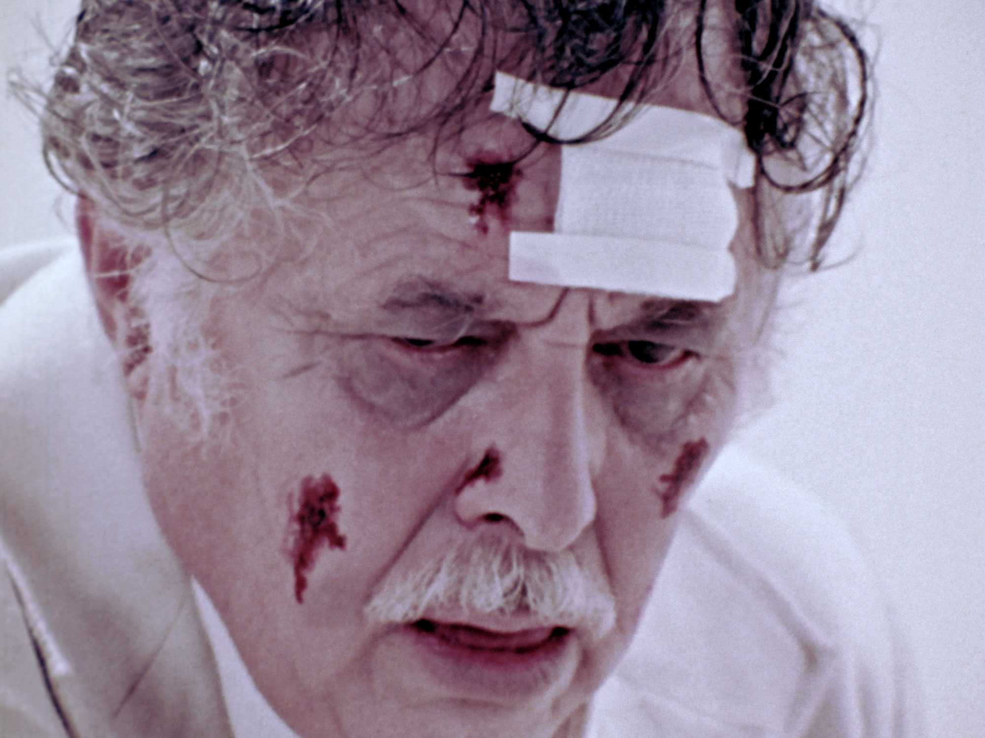The film’s second frame, bookending the central narrative, takes place in a bare, sterile white room. There sits the unnamed character played by Maazel, his white suit dirty, his hair unkempt, his face bloody and bandaged, when his cheerier double arrives, with white suit immaculate, hair neat, face unmarked. It is as though we are looking at a before-and-after picture, as these two old twins respectively embody innocence and experience.