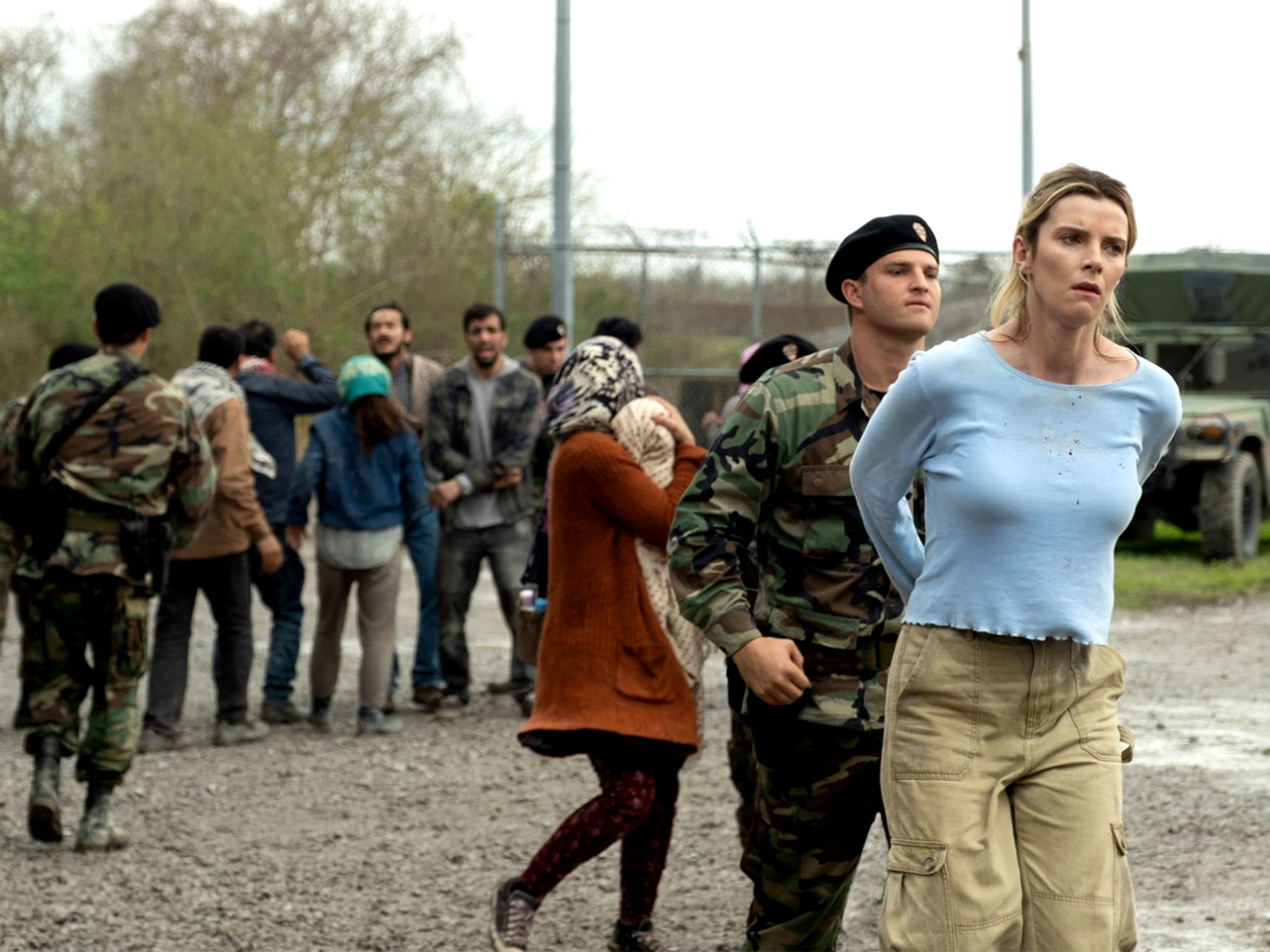 After a pair of relatively clever false stars, the protagonist role gets filled by Crystal, a product of the rural lower class from her faux-elegant name all the way down. Though Betty Gilpin avails herself well, making expert use of her Amazonian stature and a face trained by an off-Broadway upbringing to project expression, she’s fighting the material even harder than her pursuing assassins. Still, she has the best go of bringing the broad stereotype she’s been dealt to life, far better than the Alex Jones stand-in (Ethan Suplee) or the sorority girl simply named “Yoga Pants” (Emma Roberts).