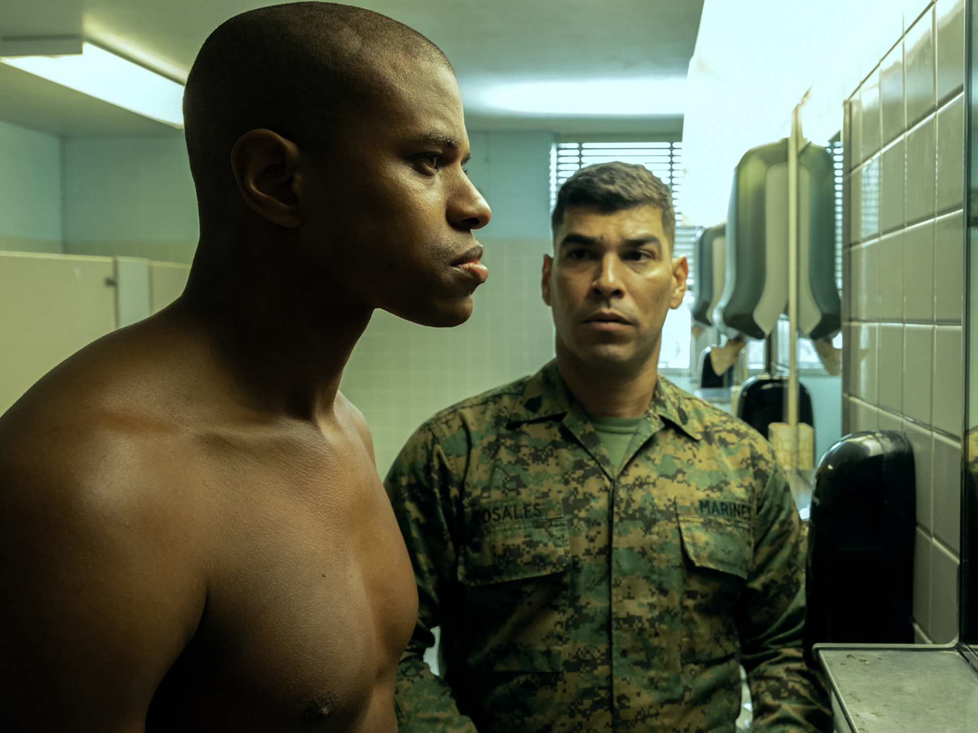 Welcome to the US military, a khaki-coloured world of gritted teeth, repression and rigidity confined to corridors, showers and fields. This is the world of Elegance Bratton’s The Inspection, where the upper ranks are in the business of constructing the next generation of furiously servile automata on a sweaty production line. The imposing colonel Leland Laws (Bokeem Woodbine) takes this image further, in a moment hewn of grim determination and bitter spittle – “Our job is not to make Marines, it’s to make monsters.”