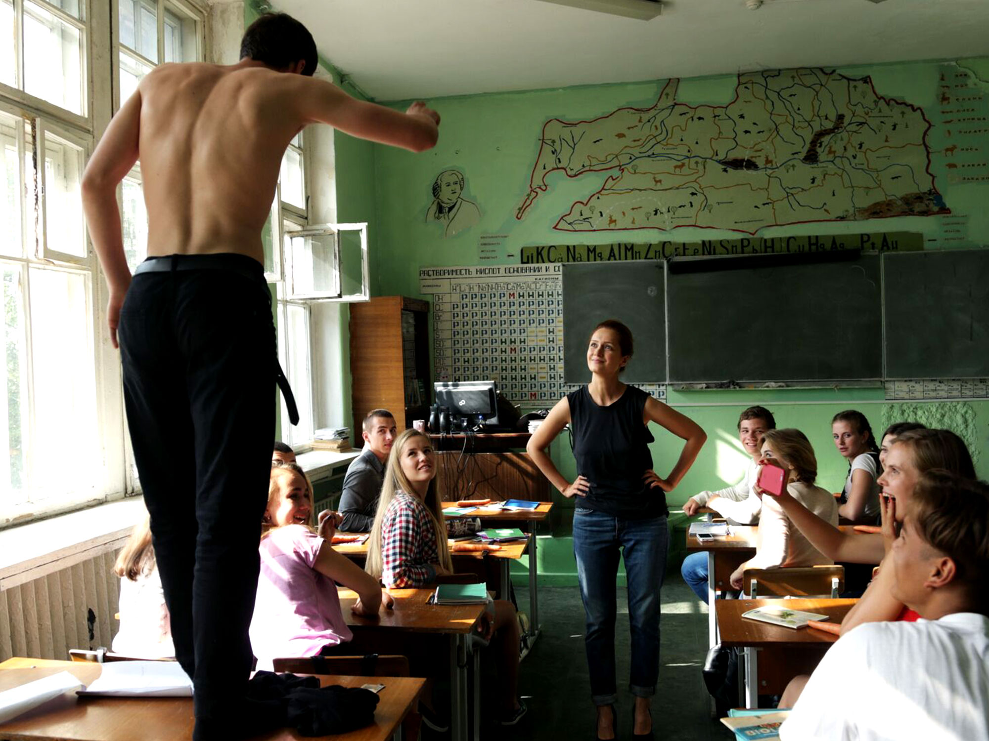 Teachers blindly accept a strict religious syllabus, yet they discipline the boy for following them in the obsessive manner he does. The most centred character is his Biology teacher (Viktoriya Isakova) who is sensitive to religion and open to scientific teachings despite adversity from conservative colleagues and the explosive Veniamin.