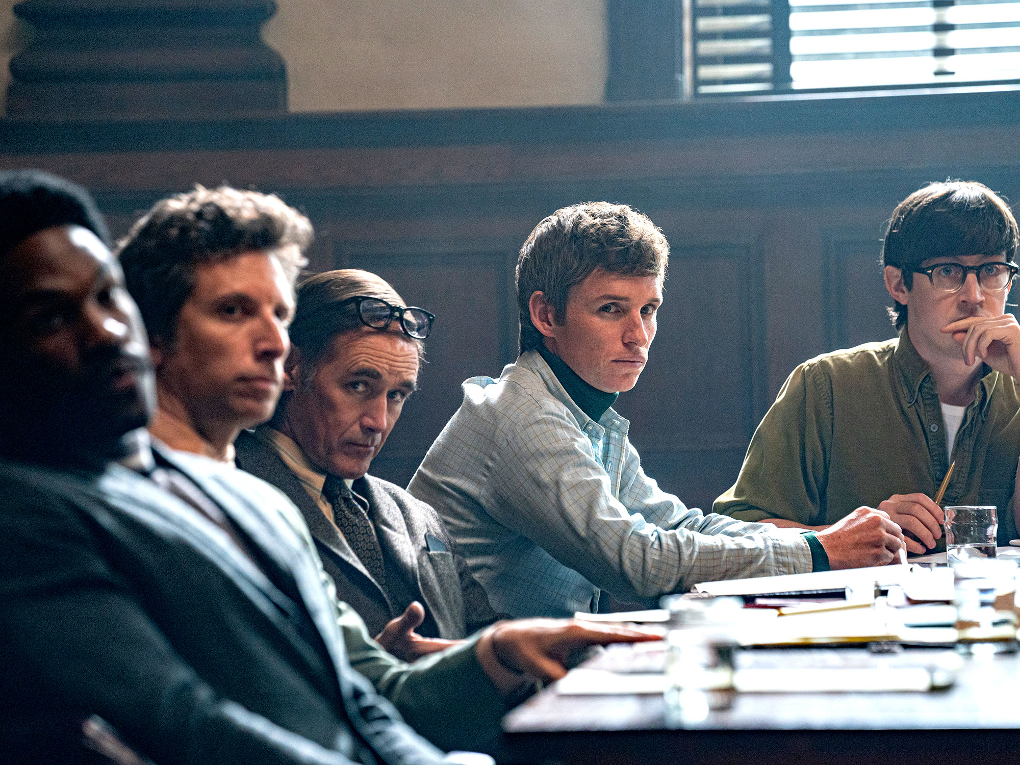 And yet this message gets somewhat diminished, as does the excitement of this high-wire judicial process, by the Sorkinian fondness for liberal congratulation. Bobby Seale gets little to do aside from demand the lawyer he deserves and model heinous suffering in one shocking scene. But the white lawyers get a round-of-applause moment when they valiantly call out the judge’s racism, and the triumphant finale goes to Tom when he uses his closing statement to pay homage to soldiers fallen during the span of the trial.