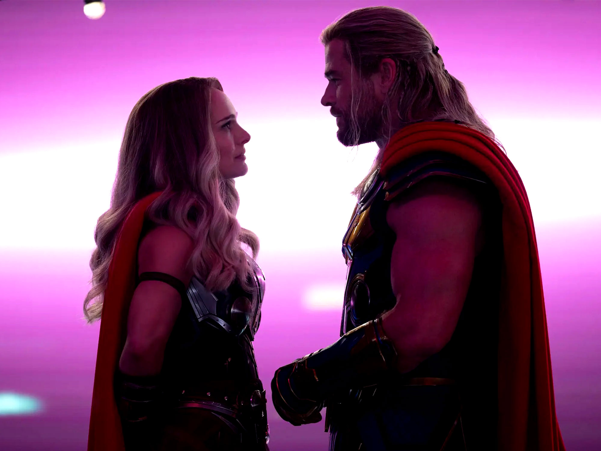 The biggest surprise in Love and Thunder is how it wastes its pint-sized supporting cast; the plucky youngsters whose fate rests in Thor’s hands remain on the periphery throughout, and save for a short but very sweet scene late on, Hemsworth is given little opportunity to meaningfully interact with them. Instead, Waititi and Jennifer Kaytin Robinson’s screenplay ramps up the romantic stakes, switching from swashbuckling space romp to teary cancer drama while faintly blurring the line between mythology, fantasy, and science (in this way the film resembles a West End panto version of Darren Aronofsky’s The Fountain).