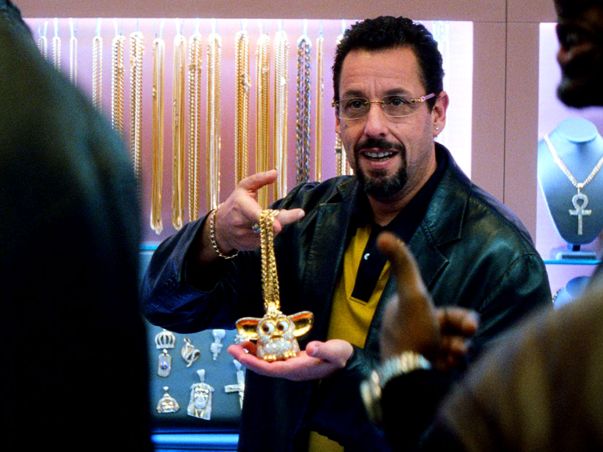 Sandler, as always, is at the heart of the chaos. As New York diamond dealer Howard Ratner, his uniform is striking: rimless Cartier glasses, a Ferragamo logo belt, Gucci horsebit loafers. He looks put together, if not anachronistic – a relic of old money who’s either unconcerned with or unable to keep up with the latest trends. He has a beautiful soon-to-be-ex-wife named Dinah (Idina Menzel), and three kids, who live in a plush mini-mansion in Long Island, while Howard works in Manhattan selling jewellery to basketball players and entertains a sweet romance with employee, Julia (Julia Fox). But Ratner, like all of the Safdies’ struggling protagonists, is paddling frantically to keep his head above water.